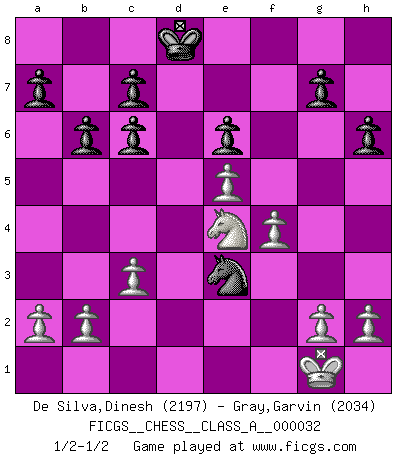 Last move : 1/2-1/2 2008 June 5 10:1:4 [Event "FICGS__CHESS__CLASS_A__000032"] [Site "FICGS"] [Date "2007.11.30"] [Round "1"] [White "De Silva,Dinesh"] [Black "Gray,Garvin"] [Result "1/2-1/2"] [WhiteElo "2197"] [BlackElo "2034"] 1.e4 e5 2.Nf3 Nc6 3.Bb5 Nf6 4.O-O Nxe4 5.d4 Nd6 6.Bxc6 dxc6 7.dxe5 Nf5 8.Qxd8+ Kxd8 9.Nc3 Ke8 10.Rd1 Be7 11.Bg5 Bxg5 12.Nxg5 Ke7 13.Rd3 Be6 14.Rad1 Rad8 15.Rxd8 Rxd8 16.Rxd8 Kxd8 17.Nxe6+ fxe6 18.Ne4 b6 19.c3 h6 20.f4 Ne3 1/2-1/2 Ruy Lopez : Berlin defense, Open variation Kingside Castling by player White (move 4) This chess game ended in a draw. Follow this game move after move (download)Don't even mention losing to me. I can't stand to think of it. (Bobby Fischer) Smyslow ist ein Beweis dafür, dass ich noch zehn Jahre spielen kann! [der 75 jährige über den 85 jährigen] (Viktor Kortschnoi) El juego de Fischer siempre fue nítido, racional y brillante. Uno de los mejores por siempre. (Dave Regis) Les Echecs représentent une sphère d'idées créatrices basée sur la volonté des deux protagonistes. (Smyslov) It is not true that people stop pursuing dreams because they grow old, they grow old because they stop pursuing dreams. (Gabriel Garcia Marquez)