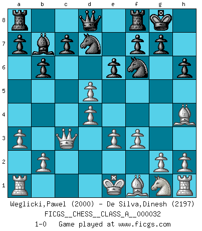 Last move : 1-0 2008 March 23 0:52:49 [Event "FICGS__CHESS__CLASS_A__000032"] [Site "FICGS"] [Date "2007.11.30"] [Round "1"] [White "Weglicki,Pawel"] [Black "De Silva,Dinesh"] [Result "1-0"] [WhiteElo "2000"] [BlackElo "2197"] 1.d4 Nf6 2.c4 e6 3.Nc3 Bb4 4.Qc2 O-O 5.a3 Bxc3+ 6.Qxc3 b6 7.Bg5 Bb7 8.f3 h6 9.Bh4 d5 10.e3 Nbd7 11.cxd5 1-0 Nimzo-Indian : Classical variation Kingside Castling by player Black (move 4) Player White won this chess game. Follow this game move after move (download)You may learn much more from a game you lose than from a game you win. You will have to lose hundreds of games before becoming a good player. (Jose Raul Capablanca) Es gibt keine einzige Frau, der ich nicht einen Springer vorgeben könnte und trotzdem gewänne. (Robert James Fischer) Cuando le juegas a Fischer, no es una cuestion de si vas a ganar o perder. Es una cuestion de si vas a sobrevivir. (Boris Spassky) Même un GMI sait rarement calculer sur plus de cinq coups une attaque à sacrifices. (Rudolf Spielmann) Luck never made a man wise. (Seneca, Letters to Lucilius)