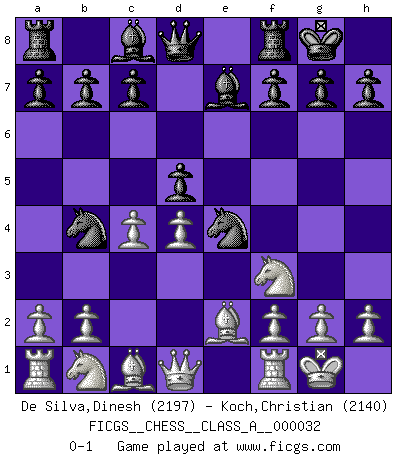 Last move : 0-1 2008 January 22 11:36:38 [Event "FICGS__CHESS__CLASS_A__000032"] [Site "FICGS"] [Date "2007.11.30"] [Round "1"] [White "De Silva,Dinesh"] [Black "Koch,Christian"] [Result "0-1"] [WhiteElo "2197"] [BlackElo "2140"] 1.e4 e5 2.Nf3 Nf6 3.Nxe5 d6 4.Nf3 Nxe4 5.d4 d5 6.Bd3 Nc6 7.O-O Be7 8.c4 Nb4 9.Be2 O-O 0-1 This chess game has been lost on time (started : 2007.11.30 8:25:0) Petrov : Classical attack Kingside Castling by player White (move 7) Kingside Castling by player Black (move 9) Player Black won this chess game. Follow this game move after move (download)I have always a slight feeling of pity for the man who has no knowledge of Chess. (Siegbert Tarrasch) Ich habe Kasparov in Rente geschickt. (Veselin Topalov) Entre mas años cumplo, mas valoro los Peones. (Keres) Psychologiquement, tu dois avoir confiance en toi même, mais cette confiance doit être basée sur des faits. (Robert Fischer) Only sick music makes money today. (Friedrich Nietzsche)