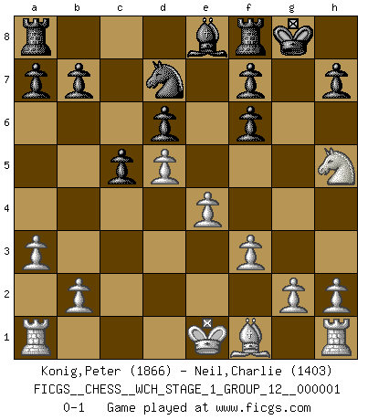 Last move : 0-1 2006 September 23 2:50:38 [Event "FICGS__CHESS__WCH_STAGE_1_GROUP_12__000001"] [Site "FICGS"] [Date "2006.07.01"] [Round "1"] [White "Konig,Peter"] [Black "Neil,Charlie"] [Result "0-1"] [WhiteElo "1866"] [BlackElo "1403"] 1.d4 Nf6 2.c4 e6 3.Nc3 Bb4 4.f3 c5 5.d5 exd5 6.cxd5 d6 7.e4 Qa5 8.Bd2 Bd7 9.a3 Bxc3 10.Bxc3 Qd8 11.Qd2 O-O 12.Qg5 Be8 13.Bxf6 Qxf6 14.Qxf6 gxf6 15.Ne2 Nd7 16.Ng3 Ne5 17.Nh5 Nd7 0-1 This chess game has been lost on time (started : 2006.07.01 16:15:41) Nimzo-Indian : Kmoch variation Kingside Castling by player Black (move 11) Player Black won this chess game. Follow this game move after move (download)Some sacrifices are sound; the rest are mine. (Mikhail Tal) Ein bischen Romantik kann weder im Schach noch in der Liebe schaden. Also versuche ich mich ab und zu daran zu erinnern. (Nigel Short) Alekhine es un poeta que crea un trabajo de arte de algo que raramente inspiraría a otra persona a mandar una tarjeta postal. (Max Euwe) Fischer est le meilleur joueur du monde et Karpov n'est qu'un joueur de bistrot. (Garry Kasparov, agé de 16 ans) The Internet isn't free. It just has an economy that makes no sense to capitalism. (Brad Shapcott)