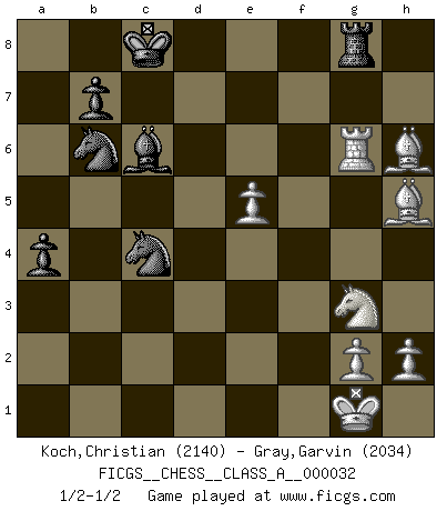 Last move : 1/2-1/2 2008 May 3 23:7:53 [Event "FICGS__CHESS__CLASS_A__000032"] [Site "FICGS"] [Date "2007.11.30"] [Round "1"] [White "Koch,Christian"] [Black "Gray,Garvin"] [Result "1/2-1/2"] [WhiteElo "2140"] [BlackElo "2034"] 1.e4 e6 2.d4 d5 3.Nc3 Bb4 4.e5 c5 5.a3 Bxc3+ 6.bxc3 Qc7 7.Qg4 Ne7 8.Qxg7 Rg8 9.Qxh7 cxd4 10.Ne2 Nbc6 11.f4 Bd7 12.Qd3 dxc3 13.Qxc3 O-O-O 14.Ng3 d4 15.Qc4 Nd5 16.Bd3 Nb6 17.Qb3 Na5 18.Qb4 Nac4 19.O-O a5 20.Qe7 Rg7 21.Be4 Bc6 22.Qxc7+ Kxc7 23.Bd3 Rh8 24.f5 Rh4 25.fxe6 fxe6 26.Rf4 Rxf4 27.Bxf4 Rg4 28.Bc1 Kc8 29.Rb1 Rg7 30.Bh6 Rg8 31.Be2 Ba4 32.Rd1 Nxa3 33.Rxd4 Nxc2 34.Rd6 Bc6 35.Bd1 Na3 36.Rxe6 Nac4 37.Bh5 a4 38.Rg6 1/2-1/2 French : Winawer, Classical variation Queenside Castling by player Black (move 13) Kingside Castling by player White (move 19) This chess game ended in a draw. Follow this game move after move (download)Every Chess master was once a beginner. (Chernev) Den Ruhm habe ich schon, jetzt brauche ich noch das Geld. (Wilhelm Steinitz) Bobby Fischer es el jugador de Ajedrez mas grande que jamás haya existido. (Ken Smith) La conception d'un plan est le processus par lequel un joueur exploite les avantages de sa position tout en s'efforçant d'en réduire au minimum les inconvénients. Afin de garantir le succès, un plan doit toujours se fonder sur un diagnostic objectif des particularités d'une position. La conception d'un plan est d'autant plus difficile que la position est équilibrée, et grandement facilitée lorsqu'il n'existe qu'un seul plan susceptible de répondre aux exigences de la position. (Harry Golombek) There is a computer disease that anybody who works with computers knows about. It's a very serious disease and it interferes completely with the work. The trouble with computers is that you 'play' with them ! (Richard P. Feynman)