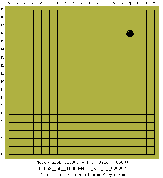 Last move : 1-0 2007 December 31 22:17:55 [Event "FICGS__GO__TOURNAMENT_KYU_I__000002"] [Site "FICGS"] [Date "2007.11.30"] [Round "1"] [Black "Nosov,Gleb"] [White "Tran,Jason"] [Result "1-0"] [Rating 1 "1100"] [Rating 2 "0600"] 1.q16 1-0 This go game has been lost on time (started : 2007.11.30 22:28:48) Here are the names of the openings (joseki) played in the four corners : Player Black won this Go (weiqi, baduk) game. Follow this game move after move (download)The possibility or impossibility of an event results logically from the rules. (Pierre Audouard) Players are not good because they find tactics, it is about the way to find the positions in which those tactics are hidden. (Luc-Olivier Leclerc)