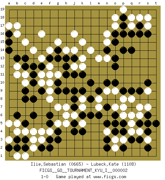 Last move : 1-0 2008 March 11 19:25:55 [Event "FICGS__GO__TOURNAMENT_KYU_I__000002"] [Site "FICGS"] [Date "2007.11.30"] [Round "1"] [Black "Ilie,Sebastian"] [White "Lubeck,Kate"] [Result "1-0"] [Rating 1 "0665"] [Rating 2 "1108"] 1.q16 d4 2.q3 e16 3.r9 c15 4.f3 f4 5.g4 e3 6.f5 e4 7.g3 g5 8.f6 h5 9.j4 h7 10.d6 f8 11.c5 c4 12.c8 d9 13.c9 c10 14.d10 e10 15.d11 c11 16.e9 f9 17.d8 e11 18.d12 e13 19.e12 f12 20.f13 f11 21.g13 d14 22.c12 b12 23.b13 b11 24.c13 f14 25.h12 j16 26.g10 f10 27.h9 g7 28.k6 k8 29.j8 k7 30.j7 j6 31.j5 h6 32.k9 k5 33.l6 m7 34.m6 m8 35.k4 j10 36.j9 g11 37.h11 h10 38.g9 k10 39.l10 j12 40.j13 k12 41.m9 h14 42.h13 k13 43.k14 j14 44.k11 l14 45.j11 k15 46.g14 g15 47.l8 o17 48.q14 o14 49.o13 r4 50.r3 q4 51.p4 r7 52.p9 p7 53.p5 q6 54.s6 s7 55.s4 s5 56.r5 r6 57.t5 q5 58.s5 s3 59.s2 p3 60.p2 o3 61.n5 o5 62.o4 n4 63.o6 p6 64.o5 o7 65.n3 o2 66.n2 q8 67.q9 n9 68.n10 o9 69.o10 p8 70.n7 n13 71.o12 q18 72.r17 r18 73.p17 o18 74.o16 n16 75.o15 n15 76.p14 s17 77.s16 q17 78.r16 s18 79.n14 m13 80.a16 b16 81.a14 a17 82.a15 b17 83.c2 d2 84.c3 b5 85.b6 a5 86.b3 b4 87.f2 a3 88.e2 c1 89.b2 b1 90.a2 d3 91.p18 p19 92.p16 s9 93.s10 1-0 Here are the names of the openings (joseki) played in the four corners : Corner d4 : d4 f3 Hoshi (Hwajeom, Seongjeom, Xingwei`) 4-4 Point. The star or hoshi (4-4) point, emphasizing influence at the potential expense of territory. Ikken Kakari (Hankan Keolch'im, Yi Gua`jiao~, 1-Space Low Approach). Black 2 is the standard approach move to the 4-4. Corner q16 : q16 l14 Hoshi (Hwajeom, Seongjeom, Xingwei`) 4-4 Point. The star or hoshi (4-4) point, emphasizing influence at the potential expense of territory. Player Black won this Go (weiqi, baduk) game. Follow this game move after move (download)If White takes all four corners, Black should resign; if Black takes all four corners, Black should also resign. (David Kent) Wikichess, chess moves explained by 'experimented' players. (Thibault de Vassal)