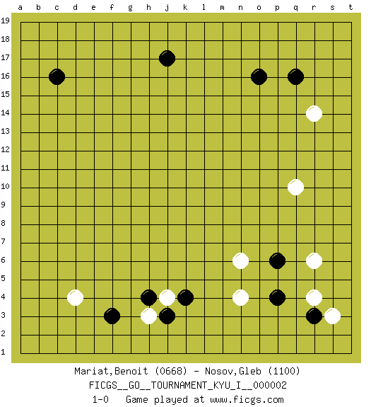 Last move : 1-0 2008 January 14 23:13:59 [Event "FICGS__GO__TOURNAMENT_KYU_I__000002 "] [Site "FICGS"] [Date "2007.11.30"] [Round "1"] [Black "Mariat,Benoit "] [White "Nosov,Gleb "] [Result "1-0"] [Rating 1 "0668"] [Rating 2 "1100"] 1.q16 r4 2.c16 d4 3.j17 r14 4.o16 q10 5.p4 n4 6.p6 r6 7.r3 s3 8.k4 n6 9.f3 h3 10.h4 j4 11.j3 1-0 This go game has been lost on time (started : 2007.11.30 22:28:48) Here are the names of the openings (joseki) played in the four corners : Corner q16 : q16 r14Hoshi (Hwajeom, Seongjeom, Xingwei`) 4-4 Point. The star or hoshi (4-4) point, emphasizing influence at the potential expense of territory.Ikken Kakari (Hankan Keolch'im, Yi Gua`jiao~, 1-Space Low Approach). White 2 is the standard approach move to the 4-4. Corner q4 : r4 p4Komoku (Somok, Xiao~mu`) 3-4 Point. The komoku (3-4) point is the traditional corner enclosure move..Ikken Takagakari (Hankan Nop'dakeolch'im, Yi Gaogua`jiao~, 1-Space High Approach). The 5-4 approach move has become more popular in modern times, as modern Go emphasizes speed and influence. Corner d4 : d4 f3Hoshi (Hwajeom, Seongjeom, Xingwei`) 4-4 Point. The star or hoshi (4-4) point, emphasizing influence at the potential expense of territory.Ikken Kakari (Hankan Keolch'im, Yi Gua`jiao~, 1-Space Low Approach). Black 2 is the standard approach move to the 4-4. Player Black won this Go (weiqi, baduk) game.Follow this game move after move (download ) The simplest move is the best move. (Anonymous) Macintosh - we might not get everything right, but at least we knew the century was going to end. (Douglas Adams)