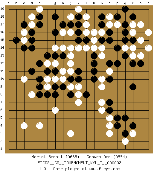 Last move : 1-0 2008 April 8 0:55:55 [Event "FICGS__GO__TOURNAMENT_KYU_I__000002"] [Site "FICGS"] [Date "2007.11.30"] [Round "1"] [Black "Mariat,Benoit"] [White "Groves,Don"] [Result "1-0"] [Rating 1 "0668"] [Rating 2 "0994"] 1.q16 c4 2.q3 d17 3.r9 e4 4.d15 c15 5.c14 c16 6.d14 c10 7.e17 j3 8.k16 r14 9.r12 r17 10.q17 r16 11.q15 q14 12.r15 s15 13.s16 s17 14.s14 t16 15.p14 s13 16.q13 r13 17.s12 t14 18.p12 o3 19.p5 r3 20.r4 q4 21.q5 q2 22.p4 o4 23.d16 d18 24.e18 e19 25.c17 o5 26.o6 n6 27.o7 n7 28.b15 n9 29.e10 d8 30.f8 g6 31.m11 o17 32.o16 q18 33.p18 o18 34.r18 p17 35.q19 l17 36.k17 l18 37.k18 n16 38.o15 l16 39.l15 m15 40.n15 l14 41.k15 n14 42.m13 m14 43.n17 m16 44.n18 k14 45.k10 j14 46.g16 k19 47.d11 j18 48.h17 j16 49.j17 h16 50.g18 n13 51.m12 j12 52.k11 j11 53.j10 h10 54.g11 h11 55.h9 g10 56.g9 g12 57.h13 h14 58.g13 g14 59.f13 j13 60.f11 f12 61.e12 f10 62.e9 f9 63.m10 j9 64.j8 k9 65.l8 k8 66.g8 k7 67.e8 o11 68.o10 n10 69.o12 1-0 Here are the names of the openings (joseki) played in the four corners : Corner d16 : d17 d15 Komoku (Somok, Xiao~mu`) 3-4 Point. The komoku (3-4) point is the traditional corner enclosure move.. Ikken Takagakari (Hankan Nop'dakeolch'im, Yi Gaogua`jiao~, 1-Space High Approach). The 5-4 approach move has become more popular in modern times, as modern Go emphasizes speed and influence. Corner q16 : q16 r14 Hoshi (Hwajeom, Seongjeom, Xingwei`) 4-4 Point. The star or hoshi (4-4) point, emphasizing influence at the potential expense of territory. Ikken Kakari (Hankan Keolch'im, Yi Gua`jiao~, 1-Space Low Approach). White 2 is the standard approach move to the 4-4. Player Black won this Go (weiqi, baduk) game. Follow this game move after move (download)Territory really exists only in the end. (Pierre Audouard) Optimism is a variety of information deficit. Sometimes especially true for correspondence chess games. (Michael Aigner)