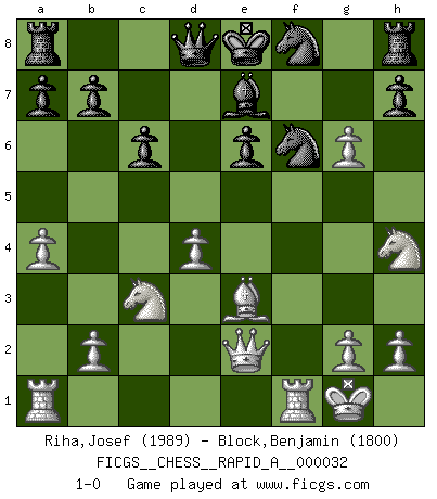Last move : 1-0 2007 December 28 15:42:46 [Event "FICGS__CHESS__RAPID_A__000032"] [Site "FICGS"] [Date "2007.12.01"] [Round "1"] [White "Riha,Josef"] [Black "Block,Benjamin"] [Result "1-0"] [WhiteElo "1989"] [BlackElo "1800"] 1.d4 d5 2.Nf3 Nf6 3.c4 c6 4.Nc3 dxc4 5.a4 Bf5 6.e3 e6 7.Bxc4 Nbd7 8.O-O Bd6 9.Qe2 e5 10.Nh4 Bg4 11.f3 Be6 12.Bxe6 fxe6 13.f4 exd4 14.exd4 Nf8 15.f5 Be7 16.Be3 g6 17.fxg6 1-0 Queen's pawn game Kingside Castling by player White (move 8) Player White won this chess game. Follow this game move after move (download)There are two classes of men; those who are content to yield to circumstances and who play whist; those who aim to control circumstances, and who play Chess. (Mortimer Collins) Ein bischen Romantik kann weder im Schach noch in der Liebe schaden. Also versuche ich mich ab und zu daran zu erinnern. (Nigel Short) Alekhine es un poeta que crea un trabajo de arte de algo que raramente inspiraría a otra persona a mandar una tarjeta postal. (Max Euwe) Ce qui caractérise les parties de combat, c'est que si le défenseur a constamment de difficiles problèmes à résoudre, l'attaquant doit chercher sans relâche de nouvelles possibilités d'attaque. (Koblentz) The arrogant army will lose certainly the battle. (Chinese proverb)