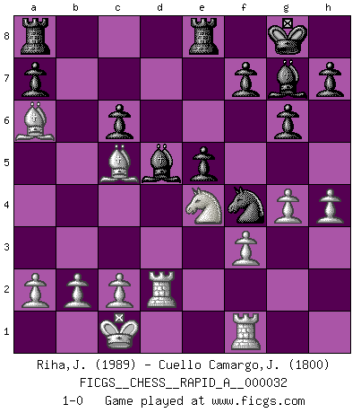 Last move : 1-0 2008 January 20 11:28:26 [Event "FICGS__CHESS__RAPID_A__000032"] [Site "FICGS"] [Date "2007.12.01"] [Round "1"] [White "Riha,Josef"] [Black "Cuello Camargo,Jose Javier"] [Result "1-0"] [WhiteElo "1989"] [BlackElo "1800"] 1.e4 c5 2.Nf3 d6 3.d4 cxd4 4.Nxd4 Nf6 5.Nc3 g6 6.Be3 Bg7 7.f3 O-O 8.Qd2 Nc6 9.O-O-O d5 10.exd5 Nxd5 11.Nxc6 bxc6 12.Bd4 e5 13.Bc5 Be6 14.Ne4 Re8 15.h4 Nf4 16.g3 Qxd2+ 17.Rxd2 Nh5 18.g4 Nf4 19.Ba6 Bd5 20.Rf1 1-0 This chess game has been lost on time (started : 2007.12.01 11:31:51) Sicilian : Dragon, Yugoslav attack, 7...O-O Kingside Castling by player Black (move 7) Queenside Castling by player White (move 9) Player White won this chess game. Follow this game move after move (download)No Chess Grandmaster is normal; they only differ in the extent of their madness. (Viktor Korchnoi) Mein erstes Ziel war nicht, die Partie zu gewinnen, sondern eine Figur zu opfern. -- der junge (Wilhelm Steinitz) El ganar no lo es todo... pero el perder es nada. (Mednis) La vérité est comme le meilleur coup aux échecs : elle existe, mais il faut la chercher. (Arturo Perez-Reverte) Nothing is more important for teaching us to understand the concepts we have than constructing fictitious ones. (Ludwig Wittgenstein)