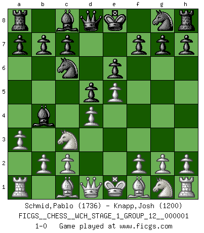 Last move : 1-0 2006 October 13 6:13:9 [Event "FICGS__CHESS__WCH_STAGE_1_GROUP_12__000001"] [Site "FICGS"] [Date "2006.07.01"] [Round "1"] [White "Schmid,Pablo"] [Black "Carlo,John"] [Result "1-0"] [WhiteElo "1736"] [BlackElo "1200"] 1.d4 d5 2.e4 e6 3.Nc3 Nc6 4.e5 Bb4 5.a3 1-0 This chess game has been lost on time (started : 2006.07.01 16:15:41) Blackmar gambit Player White won this chess game. Follow this game move after move (download)The passion for playing Chess is one of the most unaccountable in the world. (H.G. Wells) Mein erstes Ziel war nicht, die Partie zu gewinnen, sondern eine Figur zu opfern. -- der junge (Wilhelm Steinitz) Bobby Fischer es el jugador de Ajedrez mas grande que jamás haya existido. (Ken Smith) Votre seul travail dans les ouvertures est d'obtenir un milieu de partie jouable. (Lajos Portish) The mind is like a parachute, it only functions when its open. (Unknown)