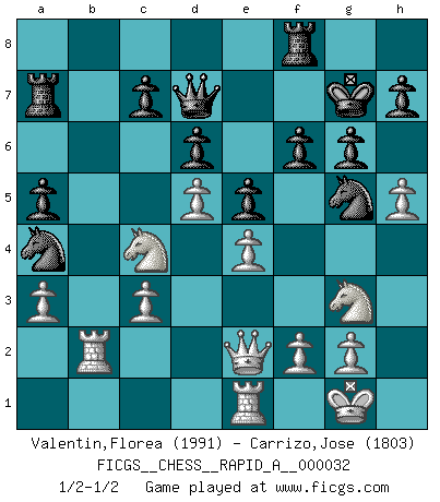 Last move : 1/2-1/2 2008 March 27 19:21:59 [Event "FICGS__CHESS__RAPID_A__000032"] [Site "FICGS"] [Date "2007.12.01"] [Round "1"] [White "Valentin,Florea"] [Black "Carrizo,Jose"] [Result "1/2-1/2"] [WhiteElo "1991"] [BlackElo "1803"] 1.e4 e5 2.Nf3 Nc6 3.Bb5 a6 4.Ba4 d6 5.c3 Nf6 6.d4 Bd7 7.Nbd2 Be7 8.O-O O-O 9.Re1 Re8 10.Nf1 Bf8 11.Ng3 g6 12.h3 Bg7 13.Bc2 Qe7 14.Be3 Kh8 15.d5 Nb8 16.Ba4 Bxa4 17.Qxa4 Nbd7 18.Rad1 Ng8 19.Qb3 b6 20.Qc4 Rec8 21.b4 a5 22.Bg5 f6 23.Be3 Bh6 24.a3 Bxe3 25.Rxe3 Kg7 26.Nd2 Nh6 27.Rf3 Ra7 28.Qd3 Nf7 29.h4 Rca8 30.Nc4 Kg8 31.Qe2 Rf8 32.Rb1 Kg7 33.bxa5 bxa5 34.Re3 Nc5 35.Qg4 Qd8 36.h5 Ng5 37.R3e1 Qe8 38.Qe2 Qd7 39.Rb2 Na4 1/2-1/2 Ruy Lopez : Modern Steinitz defense Kingside Castling by player White (move 8) Kingside Castling by player Black (move 8) This chess game ended in a draw. Follow this game move after move (download)The tactician knows what to do when there is something to do; whereas the strategian knows what to do when there is nothing to do. (Gerald Abrahams) Gewöhnliche Menschen denken nur daran, wie sie ihre Zeit verbringen. Ein intelligenter Mensch versucht, sie auszunutzen. (Arthur Schopenhauer) Ayuda a tus piezas para que ellas te puedan ayudar. (Paul Morphy) Le thème de l'attaque double intervient d'une manière ou d'une autre dans l'immense majorité des combinaisons. (Youri Averbakh) Quotation,n.: The act of repeating erroneously the words of another. The words erroneously repeated. (Ambrose Bierce, The Devil's Dictionary)