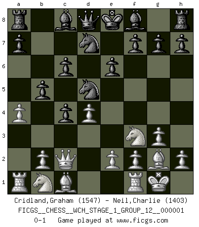 Last move : 0-1 2006 August 12 17:30:22 [Event "FICGS__CHESS__WCH_STAGE_1_GROUP_12__000001"] [Site "FICGS"] [Date "2006.07.01"] [Round "1"] [White "Cridland,Graham"] [Black "Neil,Charlie"] [Result "0-1"] [WhiteElo "1547"] [BlackElo "1403"] 1.d4 Nf6 2.c4 e6 3.g3 d5 4.Bg2 c6 5.Nf3 Nbd7 6.O-O dxc4 7.Qc2 b5 8.a4 Nd5 0-1 This chess game has been lost on time (started : 2006.07.01 16:15:41) Catalan : Closed Kingside Castling by player White (move 6) Player Black won this chess game. Follow this game move after move (download)You cannot play at Chess if you are kind-hearted. (French Proverb) Korrekt heißt in Deutschland die Haltung eines Mannes, dessen Benehmen nach dem Urteile seiner Nachbarn seiner Stellung angemessen ist. Um korrekt zu sein, muß man sich der Meinung der anderen anpassen... (Emanuel Lasker) Un Peón pasado es un criminal, quién debe ser mantenido bajo candado y llave. Leves medidas, tales como vigilancia policiaca, no son suficientes. (Aaron Nimzovich) Le moment que je préfère le plus dans une rencontre, c'est celui où je sens que la personnalité de l'adversaire se brise. (Robert Fischer) Be who you are, and say what you feel because those who mind don't matter, and those who matter don't mind. (Dr Seuss)