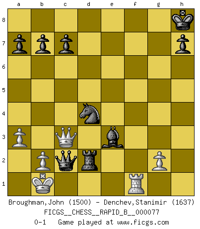 Last move : 0-1 2008 January 16 15:20:41 [Event "FICGS__CHESS__RAPID_B__000077"] [Site "FICGS"] [Date "2007.12.02"] [Round "1"] [White "Broughman,John"] [Black "Denchev,Stanimir"] [Result "0-1"] [WhiteElo "1500"] [BlackElo "1637"] 1.d4 d5 2.Nf3 Nf6 3.Bg5 Ne4 4.e3 Nxg5 5.Nxg5 e5 6.Nxf7 Kxf7 7.Qh5 g6 8.Qxe5 Bg7 9.Qf4 Bf6 10.Bd3 Rf8 11.Qf3 Kg8 12.Qd1 Qe7 13.Nd2 Bg7 14.Qe2 Nc6 15.a3 Bf5 16.h4 Rae8 17.h5 Bxd3 18.Qxd3 Bxd4 19.hxg6 Rxf2 20.O-O-O Bxe3 21.Qxd5+ Qe6 22.Qh5 Qxg6 23.Qd5+ Kh8 24.Kb1 Rd8 25.Qb3 R8xd2 26.Qc3+ Nd4 27.Rxd2 Rxd2 28.Rf1 Qxc2+ 0-1 Torre attack (Tartakower variation) Queenside Castling by player White (move 20) Player Black won this chess game. Follow this game move after move (download)Chess is war over the board. The object is to crush the opponents mind. (Bobby Fischer) Der vorletzte Fehler gewinnt. (Savielly Grigorievitsch Tartakower) Yo creo que el Ajedrez posee una magia que es también una ayuda en la edad avanzada. Una rodilla reumática es olvidada durante una partida de Ajedrez y otros eventos pueden parecer algo sin importancia comparada a una catástrofe en el tablero de Ajedrez. (Vlastimil Hort) A ce moment-là, je menaçais de comprendre la position ! (Clément L'Heureux) The only difference between a tax man and a taxidermist is that the taxidermist leaves the skin. (Mark Twain)