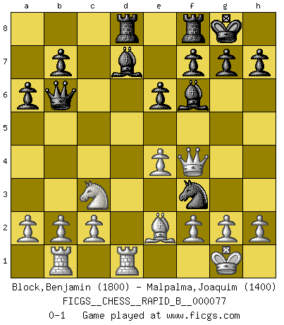 Last move : 0-1 2007 December 28 15:50:43 [Event "FICGS__CHESS__RAPID_B__000077"] [Site "FICGS"] [Date "2007.12.02"] [Round "1"] [White "Block,Benjamin"] [Black "Malpalma,Joaquim"] [Result "0-1"] [WhiteElo "1800"] [BlackElo "1400"] 1.e4 c5 2.Nf3 d6 3.d4 cxd4 4.Nxd4 Nf6 5.Nc3 Nc6 6.Bb5 Bd7 7.Bg5 e6 8.O-O Be7 9.Nf3 Qc7 10.Qd2 a6 11.Be2 O-O 12.Rfd1 Rad8 13.Bxf6 Bxf6 14.Qxd6 Qa5 15.Qd2 Qb6 16.Rab1 Ne5 17.Qf4 Nxf3+ 0-1 Sicilian Kingside Castling by player White (move 8) Kingside Castling by player Black (move 11) Player Black won this chess game. Follow this game move after move (download)Look at Garry Kasparov. After he loses, invariably he wins the next game. He just kills the next guy. That's something that we have to learn to be able to do. (Maurice Ashley) Der 70jährige Viktor Kortschnoi: Die Rentenanstalt wollte mich zwingen in Rente zu gehen. Meine Frau erhält jetzt eine Pension- und ich zahle weiter in die Rentenkasse ein! (Viktor Kortschnoi) Siempre es mejor sacrificar los hombres de tu oponente. (Savielly Tartakower) Le plus grand jeu de l'esprit jamais inventé, plus vous l'apprenez, plus vous y prenez du plaisir. (Garry Kasparov) If you ain't just a little scared when you enter a casino, you are either very rich or you haven't studied the games enough. (Pappy)