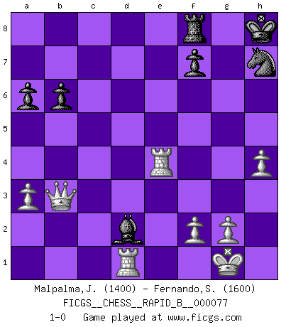 Last move : 1-0 2007 December 16 19:40:32 [Event "FICGS__CHESS__RAPID_B__000077"] [Site "FICGS"] [Date "2007.12.02"] [Round "1"] [White "Malpalma,Joaquim"] [Black "Fernando,Suranga"] [Result "1-0"] [WhiteElo "1400"] [BlackElo "1600"] 1.d4 d5 2.c4 e6 3.Nc3 Nf6 4.Bg5 Be7 5.e3 O-O 6.Nf3 h6 7.Bh4 a6 8.Qc2 b6 9.cxd5 exd5 10.Bd3 Nc6 11.a3 Be6 12.O-O Na5 13.Ne2 c5 14.Nf4 c4 15.Bf5 Bxf5 16.Qxf5 g5 17.Bxg5 hxg5 18.Qxg5+ Kh8 19.Ne5 Qd6 20.Rae1 Nb3 21.e4 dxe4 22.Re3 Nh7 23.Qh5 Qf6 24.Rh3 Qg7 25.Rg3 Bg5 26.h4 Qxe5 27.dxe5 Bxf4 28.Rg4 Bd2 29.Rxe4 Rac8 30.Rd1 c3 31.bxc3 Rxc3 32.e6 Rc5 33.Qf3 Rc6 34.e7 R6c8 35.exf8Q+ Rxf8 36.Qxb3 1-0 QGD : Neo-Orthodox variation, 7.Bh4 Kingside Castling by player Black (move 5) Kingside Castling by player White (move 12) Promotion Queen by player White (move 35) Player White won this chess game. Follow this game move after move (download)The blunders are all there on the board, waiting to be made. (Savielly Tartakover) Kombinieren und Schwarzhandel gehören verboten. (Savielly Grigorievitsch Tartakower) Una compensación adecuada por un sacrificio es tener una combinación sólida que conduce a una posición ganadora; una compensación adecuada por una metida de pata es dejar a tu oponente arrebatar una derrota de las fauces de la victoria. (Bruce A. Moon) La tactique est l'élément le plus important du milieu de jeu. (Siegbert Tarrasch) Ah, beer! The cause of, and the solution to, all of life's problems. (Homer Simpson)