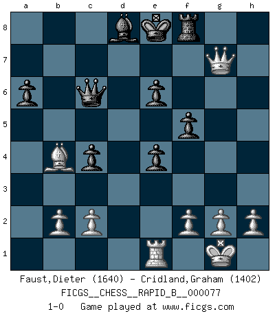 Last move : 1-0 2008 February 6 22:37:35 [Event "FICGS__CHESS__RAPID_B__000077"] [Site "FICGS"] [Date "2007.12.02"] [Round "1"] [White "Faust,Dieter"] [Black "Cridland,Graham"] [Result "1-0"] [WhiteElo "1640"] [BlackElo "1402"] 1.e4 c5 2.Nf3 e6 3.d4 cxd4 4.Nxd4 Nc6 5.Nc3 Qc7 6.Be2 a6 7.O-O Nf6 8.Be3 Bb4 9.Na4 Be7 10.Nxc6 bxc6 11.Nb6 Rb8 12.Nxc8 Qxc8 13.Bd4 c5 14.Be5 Rb6 15.Qd3 Qc6 16.Bf3 c4 17.Qc3 Bb4 18.Qe3 Rb5 19.Qf4 Be7 20.a4 Rb4 21.Bc3 Rxa4 22.Qb8+ Bd8 23.Qg3 Rxa1 24.Rxa1 Nxe4 25.Qxg7 Rf8 26.Re1 d5 27.Bxe4 dxe4 28.Qxh7 f5 29.Qg6+ Kd7 30.Qg7+ Ke8 31.Bb4 1-0 Sicilian : Taimanov (Bastrikov) variation Kingside Castling by player White (move 7) Player White won this chess game. Follow this game move after move (download)Fischer is the strongest player in the world. In fact, the strongest player who ever lived. (Larry Evans) Dein Körper muss in Topform sein. Dein Schach verfällt, wenn dein Körper verfällt. Der Körper kann nicht vom Geist getrennt werden. (Robert James Fischer) Un juego de Ajedrez es un dialogo, una conversación entre un jugador y su oponente. Cada movimiento del oponente puede contener amenazas o tropiezos, pero un jugador no se puede defender de las amenazas o tomar ventaja de los tropiezos si es que no se pregunta a sí mismo: ¿Que es lo que mi oponente va a hacer después de cada movida?. (Bruce A. Moon) C'est la seule position que je connaisse où les deux camps sont mals. Propos prêtés à V. Anand. Begin at the beginning and go on till you come to the end; then stop. (Lewis Carrol, Alice in Wonderland)