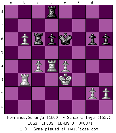 Last move : 1-0 2008 August 25 7:13:3 [Event "FICGS__CHESS__CLASS_D__000071"] [Site "FICGS"] [Date "2007.12.02"] [Round "1"] [White "Fernando,Suranga"] [Black "Schwarz,Ingo"] [Result "1-0"] [WhiteElo "1600"] [BlackElo "1627"] 1.e4 g6 2.d4 Bg7 3.Nc3 f6 4.Nf3 Nh6 5.Bc4 Nf7 6.O-O Nc6 7.Qe2 O-O 8.Be3 d6 9.Rad1 Na5 10.Bd3 Bd7 11.b4 Nc6 12.b5 Na5 13.d5 f5 14.Bd2 f4 15.Nb1 c5 16.Bxf4 c4 17.Bxc4 Nxc4 18.Qxc4 Qa5 19.Nd4 Ne5 20.Bxe5 Bxe5 21.Nc6 Qb6 22.a4 Bxc6 23.dxc6 Kg7 24.cxb7 Qxb7 25.Qd3 Rac8 26.c4 Qc7 27.Nd2 Qa5 28.Nf3 Bf6 29.Qb3 Qc7 30.Rc1 Qc5 31.Rfd1 e6 32.Qe3 Rfd8 33.Nd4 Bxd4 34.Qxd4+ Qxd4 35.Rxd4 Kf6 36.f4 Ke7 37.Rcd1 Rc5 38.Kf2 e5 39.fxe5 Rxe5 40.Ke3 Rc5 41.R1d3 Ke6 42.a5 h6 43.b6 axb6 44.axb6 Rc6 45.Rb3 1-0 Robatsch defense Kingside Castling by player White (move 6) Kingside Castling by player Black (move 7) Player White won this chess game. Follow this game move after move (download)Chess makes man wiser and clear-sighted. (Vladimir Putin) Es ist peinlich, dass ich nie Weltmeister wurde. Es wäre leicht, Leonid Breschnjew als Ursache vorzuschieben, dessen Apparat den Vorzeigekommunisten Anatoli Karpow in allem unterstützte. Aber Garri Kasparow zum Beispiel, der ebenfalls von den Sowjets unerwünscht war, hat trotz der Widerstände den WM-Titel erobert. (Viktor Kortschnoi) No todos los artistas son jugadores de Ajedrez, pero todos los jugadores de Ajedrez son artistas. (Marcel Duchamp) Si rien de grave n'est détecté lors de l'analyse d'une position, on joue alors le coup. Seconde règle de Blumenfeld. There's always a bigger fish. (Qui-Gon Jinn in Star Wars ep.1)