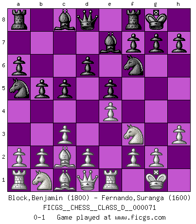 Last move : 0-1 2008 January 2 18:23:5 [Event "FICGS__CHESS__CLASS_D__000071"] [Site "FICGS"] [Date "2007.12.02"] [Round "1"] [White "Block,Benjamin"] [Black "Fernando,Suranga"] [Result "0-1"] [WhiteElo "1800"] [BlackElo "1600"] 1.e4 e5 2.Nf3 Nc6 3.Bb5 a6 4.Ba4 Nf6 5.O-O Be7 6.Re1 b5 7.Bb3 O-O 8.c3 d6 9.h3 Na5 10.Bc2 c5 0-1 Ruy Lopez : Closed, 7...O-O Kingside Castling by player White (move 5) Kingside Castling by player Black (move 7) Player Black won this chess game. Follow this game move after move (download)I won't play with you anymore. You have insulted my friend. - When an opponent cursed himself for a blunder. (Miguel Najdorf) Ich bin es gewohnt, das die Jugend mir überhaupt keinen Respekt entgegenbringt. (Alexander Morozewich) ¡Examina movidas que hagan daño! Un buen ojo for movidas desvastantes es mucho mas importante que el conocimiento de principios estratégicos. (Purdy) Même si vous avez un bon coup à faire, regardez toujours s'il n'y en a pas un qui lui soit préférable. (Pedro Damiano) For peace of mind, resign as general manager of the universe. (Douglas Adams)