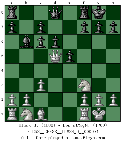 Last move : 0-1 2008 January 2 18:23:23 [Event "FICGS__CHESS__CLASS_D__000071"] [Site "FICGS"] [Date "2007.12.02"] [Round "1"] [White "Block,Benjamin"] [Black "Leurette,Marc-Antoine"] [Result "0-1"] [WhiteElo "1800"] [BlackElo "1700"] 1.e4 e5 2.Nf3 Nc6 3.Bb5 Nf6 4.d3 Bc5 5.O-O d6 6.c3 Be6 7.d4 Bb6 8.d5 Bxd5 9.exd5 Nxd5 10.Qxd5 O-O 11.Bxc6 bxc6 0-1 Ruy Lopez : Berlin defense Kingside Castling by player White (move 5) Kingside Castling by player Black (move 10) Player Black won this chess game. Follow this game move after move (download)First-class players lose to second class players because second-class players sometimes play a first-class game. (Tarrasch) Ich bin Weltmeister und muß mit niemandem irgend etwas diskutieren. (Viswanathan Anand) Cuando no sepas que mover, espera por una idea que se le venga a la la cabeza de tu oponente. Tenlo por seguro de que esa idea estará incorrecta. (Siegbert Tarrasch) Nous vivons dans un monde échiquéen : chaque jour qui passe est un défi à relever. (Philosophe Sasha) I take risks, sometimes patients die, but not taking risks causes more patients to die. So I guess my biggest problem is I've been cursed with the ability to do the math. (Gregory House, House M.D.)