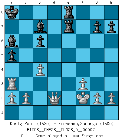 Last move : 0-1 2008 January 5 1:56:32 [Event "FICGS__CHESS__CLASS_D__000071"] [Site "FICGS"] [Date "2007.12.02"] [Round "1"] [White "Konig,Paul"] [Black "Fernando,Suranga"] [Result "0-1"] [WhiteElo "1630"] [BlackElo "1600"] 1.e4 e5 2.Nf3 Nc6 3.d4 exd4 4.Nxd4 Bc5 5.Be3 Qf6 6.c3 Nge7 7.Bc4 Ne5 8.Be2 Qg6 9.O-O d5 10.Bh5 Qxe4 11.Nd2 Qd3 12.N4f3 Bxe3 13.Nxe5 Qxd2 14.Qf3 Bf4 15.Rad1 Qxd1 16.Rxd1 Bxe5 17.Bxf7+ Kd8 18.Bxd5 c6 19.Bxc6 Kc7 20.Ba4 Nc6 21.Qf7+ Kb8 22.Bxc6 bxc6 23.Rd3 a5 24.c4 Ra7 25.Rb3+ Ka8 26.Qf3 Bd7 27.Qe3 Re8 28.Qd2 Bf4 29.Qd1 Bg4 30.f3 Rae7 31.Kf2 Bc8 32.Ra3 Bc7 33.Qd2 Ba6 0-1 Scotch game Kingside Castling by player White (move 9) Player Black won this chess game. Follow this game move after move (download)If a ruler does not understand Chess, how can he rule over a kingdom ? (King Khusros II) Der vorletzte Fehler gewinnt. (Savielly Grigorievitsch Tartakower) No soy una persona materialista y por eso, no resiento la falta o pérdida del dinero. La ausencia de cosas mundanas carece de importancia. Ya que el Ajedrez es una forma en la que puedo ser tan materialista como yo desee sin tener la necesidad de vender mi alma. (Jamie Walter Adams) Ce qui est bien, c'est d'avoir tout un tas de pièces en prise : l'adversaire ne peut en prendre qu'une à la fois. Cité par Thierry Audin. I don't diet. I just don't eat as much as I'd like to. (Linda Evangelista, supermodel)