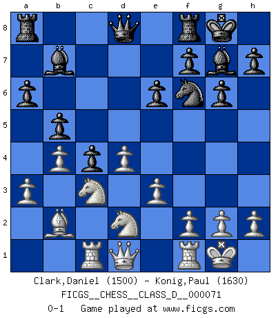 Last move : 0-1 2008 March 23 16:53:0 [Event "FICGS__CHESS__CLASS_D__000071"] [Site "FICGS"] [Date "2007.12.02"] [Round "1"] [White "Clark,Daniel"] [Black "Konig,Paul"] [Result "0-1"] [WhiteElo "1500"] [BlackElo "1630"] 1.d4 Nf6 2.e3 g6 3.b3 Bg7 4.Bb2 d5 5.Nf3 O-O 6.c4 e6 7.Nc3 c6 8.Be2 Nbd7 9.cxd5 cxd5 10.O-O a6 11.Rc1 b5 12.b4 Nb6 13.a3 Nc4 14.Bxc4 dxc4 15.Nd2 Bb7 0-1 This chess game has been lost on time (started : 2007.12.02 18:44:27) Queen's pawn game Kingside Castling by player Black (move 5) Kingside Castling by player White (move 10) Player Black won this chess game. Follow this game move after move (download)Good positions don't win games, good moves do. (Gerald Abrahams) Kein Großmeister ist normal. Sie unterscheiden sich nur im Ausmaß Ihrer Verrücktheit. (Viktor Kortschnoi) No es suficiente ser un buen jugador, se debe también de jugar bién. (Siegbert Tarrasch) Les échecs sont un jeu par leur forme, un art par leur essence et une science par sa difficulté d'acquisition. Ils peuvent vous procurer autant de plaisir qu'un bon livre ou une belle musique, mais vous n'aurez une réelle joie que si vous arrivez à bien jouer. (Tigran Petrosian) There are two types of people in this world, good and bad. The good sleep better, but the bad seem to enjoy the waking hours much more. (Woody Allen)