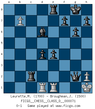 Last move : 0-1 2008 January 4 10:1:42 [Event "FICGS__CHESS__CLASS_D__000071"] [Site "FICGS"] [Date "2007.12.02"] [Round "1"] [White "Leurette,Marc-Antoine"] [Black "Broughman,John"] [Result "0-1"] [WhiteElo "1700"] [BlackElo "1500"] 1.e4 c5 2.Nf3 d6 3.Nc3 Nc6 4.Bc4 Bg4 5.d3 Nf6 6.O-O a6 7.Re1 b5 8.Bd5 Nxd5 9.exd5 Nd4 10.Nxd4 Bxd1 11.Rxd1 cxd4 12.Ne4 g6 13.Bd2 Bg7 14.c3 O-O 15.Rac1 Rc8 16.c4 bxc4 17.dxc4 Qd7 18.c5 dxc5 19.Nxc5 Qxd5 20.b4 a5 21.a3 axb4 22.axb4 e5 23.Bg5 e4 24.Re1 Rfe8 25.Bd2 Bf8 26.Nb3 Qxb3 27.Rb1 Qd3 28.b5 Qxd2 29.b6 Bd6 30.b7 Rc2 31.Rbd1 Qxf2+ 32.Kh1 Qxg2+ 0-1 Sicilian Kingside Castling by player White (move 6) Kingside Castling by player Black (move 14) Player Black won this chess game. Follow this game move after move (download)Even the laziest King flees wildly in the face of a double check ! (Aaron Nimzowitsch) Strategie ist, wie man ein Mädchen auf den Rücksitz bekommt. Taktik ist, was man tut, wenn man dann dort ist. (Anonymous) Un buen jugador siempre tiene buena suerte. (José Raúl Capablanca) Les sacrifices démontrent seulement que quelqu'un a gaffé. (Savielly Tartacover) Life is pleasant. Death is peaceful. It's the transition that's troublesome. (Isaac Asimov)