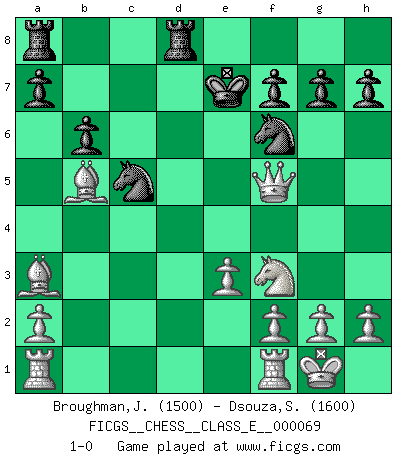 Last move : 1-0 2007 December 21 12:9:50 [Event "FICGS__CHESS__CLASS_E__000069"] [Site "FICGS"] [Date "2007.12.02"] [Round "1"] [White "Broughman,John"] [Black "Dsouza,Stanislaus"] [Result "1-0"] [WhiteElo "1500"] [BlackElo "1600"] 1.d4 d5 2.Nf3 c6 3.e3 Bf5 4.Be2 e6 5.c4 Bb4+ 6.Nc3 Bxc3+ 7.bxc3 Nf6 8.Ba3 Nbd7 9.O-O b6 10.cxd5 exd5 11.c4 c5 12.dxc5 Nxc5 13.cxd5 Qxd5 14.Bb5 Ke7 15.Qxd5 Rhd8 16.Qxf5 1-0 Queen's pawn game Kingside Castling by player White (move 9) Player White won this chess game. Follow this game move after move (download)Live, lose, and learn, by observing your opponent how to win. (Amber Steenbock) Es hat in meinem Leben Zeiten gegeben, da ich sehr nahe daran war zu glauben, daß ich auch nicht eine einzige Schachpartie verlieren könnte. (José Raúl Capablanca) Morphy probablemente fue el genio más grande de todos. (Bobby Fischer) Le joueur d'Echecs qui veut atteindre le top est obligé de développer son propre credo créatif. Alexeï Stepanovicth Souétine. Il est facile d'écrire des livres ! Ce qui est difficile, c'est de jouer ! (Alexeï Stepanovicth Souétine) Whoever said the pen is mightier than the sword obviously never encountered automatic weapons. (US General Douglas MacArthur)
