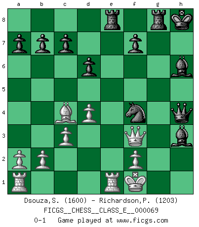 Last move : 0-1 2007 December 17 13:47:23 [Event "FICGS__CHESS__CLASS_E__000069"] [Site "FICGS"] [Date "2007.12.02"] [Round "1"] [White "Dsouza,Stanislaus"] [Black "Richardson,Patrick"] [Result "0-1"] [WhiteElo "1600"] [BlackElo "1203"] 1.d4 Nf6 2.Nf3 g6 3.Bf4 Bg7 4.e3 O-O 5.Be2 d6 6.Nbd2 Nbd7 7.c3 Nb6 8.h4 Bf5 9.Ng5 h6 10.Ngf3 Nbd5 11.Nh2 Nxf4 12.exf4 Nd5 13.g4 Bd7 14.f5 Nf4 15.O-O gxf5 16.Bc4 fxg4 17.Nxg4 e5 18.Nxh6+ Bxh6 19.Nf3 e4 20.Kh1 exf3 21.Qxf3 Qxh4+ 22.Kg1 Kh8 23.Rfc1 Rg8+ 24.Kf1 Bh3+ 25.Ke1 Bf5 26.Kf1 Rae8 27.Re1 Bh3+ 0-1 King's Indian : London system Kingside Castling by player Black (move 4) Kingside Castling by player White (move 15) Player Black won this chess game. Follow this game move after move (download)I give 98 percent of my mental energy to Chess. Others give only 2 percent. (Bobby Fischer) Gegen einen Schachcomputer zu verlieren ist wie Löcher in den Strümpfen zuhaben. Es ist nicht peinlich, solange man der einzige ist der es weiß. (Anonymous) Aquel que teme a un Peón de Reina aislado, debería de retirarse del Ajedrez. (Siegbert Tarrasch) Les erreurs sont comme les malheurs, elles n'arrivent jamais seules. (Siegbert Tarrasch) Treat your password like your toothbrush. Don't let anybody else use it, and get a new one every six months. (Clifford Stoll)