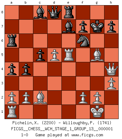 Last move : 1-0 2006 July 15 13:0:20 [Event "FICGS__CHESS__WCH_STAGE_1_GROUP_13__000001"] [Site "FICGS"] [Date "2006.07.01"] [Round "1"] [White "Pichelin,Xavier"] [Black "Willoughby,Peter"] [Result "1-0"] [WhiteElo "2200"] [BlackElo "1741"] 1.e4 e5 2.Nf3 Nc6 3.Bb5 a6 4.Ba4 Nf6 5.O-O Be7 6.Re1 b5 7.Bb3 d6 8.c3 O-O 9.h3 Nb8 10.d4 Nbd7 11.Nbd2 Bb7 12.Bc2 exd4 13.cxd4 c5 14.d5 Re8 15.Nf1 Nb6 16.Ng3 a5 17.Nf5 a4 18.Qd3 b4 19.Bg5 Ba6 20.Qd2 Nc4 21.Qf4 Bc8 22.Nxg7 Kxg7 23.e5 Nxe5 24.Nxe5 dxe5 25.Rxe5 Ra6 26.Qh4 1-0 Ruy Lopez : Closed Kingside Castling by player White (move 5) Kingside Castling by player Black (move 8) Player White won this chess game. Follow this game move after move (download)A thorough understanding of the typical mating continuations makes the most complicated sacrificial combinations leading up to them not only not difficult, but almost a matter of course. (Siegbert Tarrasch) Es ist besser die Steine des Gegners zu opfern. (Savielly Grigorievitsch Tartakower) Las combinaciones han sido siempre el aspecto más intrigante del Ajedrez. Los Maestros las buscan, el público las aplauden, los críticos las alaban. La razón se debe a que las combinaciones hacen posible que el Ajedrez sea más que un ejercicio matemático con una carencia de vida. Ellas son la poesía del juego, son del Ajedrez lo que la melodía es de la música. Ellas representan el triunfo de la mente sobre la materia. (Reuben Fine) Le génie consiste à savoir transgresser les règles au moment opportun. (Teichmann) Gambling is the son of avarice and the father of despair. (French proverb)