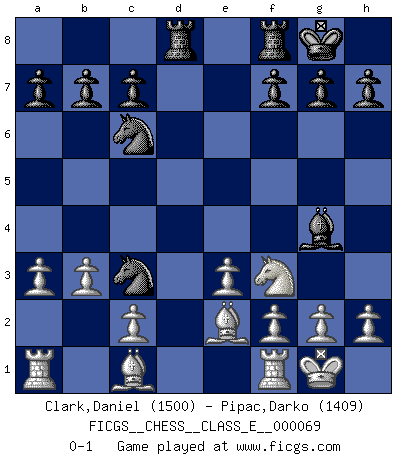 Last move : 0-1 2008 March 23 4:52:23 [Event "FICGS__CHESS__CLASS_E__000069"] [Site "FICGS"] [Date "2007.12.02"] [Round "1"] [White "Clark,Daniel"] [Black "Pipac,Darko"] [Result "0-1"] [WhiteElo "1500"] [BlackElo "1409"] 1.d4 e5 2.dxe5 Nc6 3.Nf3 d5 4.exd6 Qxd6 5.Qxd6 Bxd6 6.e3 Nf6 7.Bd2 Bb4 8.a3 Bd6 9.Be2 O-O 10.Nc3 Be5 11.O-O Bxc3 12.Bxc3 Ne4 13.Bd2 Bg4 14.Bc1 Rad8 15.b3 Nc3 0-1 This chess game has been lost on time (started : 2007.12.02 21:56:0) Queen's pawn : Charlick (Englund) gambit Kingside Castling by player Black (move 9) Kingside Castling by player White (move 11) Player Black won this chess game. Follow this game move after move (download)In complicated positions, Bobby Fischer hardly had to be afraid of anybody. (Paul Keres) Schach ist das Spiel, das die Verrückten gesund hält. (Albert Einstein) El Ajedrez expande y enriquece tu mente. (Saudin Robovic) Les écrivains ont utilisé les échecs pour analyser les côtés extrêmes de la nature humaine. Dans ce cadre, les échecs offrent un champ d'expérimentation idéal. Mais on pourrait faire la même chose avec la peinture. Et là, en vous référant à Van Gogh, vous ne tirerez pas de conclusion définitive sur les peintres. (Gary Kasparov) I don't believe in psychology. I believe in good moves. (Bobby Fischer)