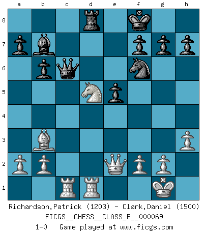 Last move : 1-0 2008 March 4 3:1:47 [Event "FICGS__CHESS__CLASS_E__000069"] [Site "FICGS"] [Date "2007.12.02"] [Round "1"] [White "Richardson,Patrick"] [Black "Clark,Daniel"] [Result "1-0"] [WhiteElo "1203"] [BlackElo "1500"] 1.d4 d5 2.c4 dxc4 3.Nf3 e6 4.e3 Nf6 5.Bxc4 c5 6.O-O Nc6 7.Qe2 cxd4 8.Rd1 Bc5 9.exd4 Nxd4 10.Nxd4 Bxd4 11.Be3 e5 12.Bxd4 O-O 13.Bc5 Qc7 14.Bxf8 Kxf8 15.h3 b6 16.Nc3 Bb7 17.Rac1 Qc6 18.Nd5 Rd8 19.Bb3 1-0 This chess game has been lost on time (started : 2007.12.02 21:56:0) QGA : 3.Nf3 Kingside Castling by player White (move 6) Kingside Castling by player Black (move 12) Player White won this chess game. Follow this game move after move (download)Bobby is the most misunderstood, misquoted celebrity walking the face of this earth. (Yasser Seirawan) Fischer: 'Remis!?' Uhlmann: 'Aber es muss doch dreimal Zugwiederholung sein!' Fischer: 'Sie nehmen das Remis an, wie ich es sage, sonst spiele ich weiter und werde Sie dann schlagen!' (Robert James Fischer) Uno por uno, yo los acribillé, mi superioridad muy pronto se volvio aparente. (Jose Capablanca) Les réformistes prétendent que les progrès de la théorie conduiront à la disparition des échecs, et qu'il faut, pour leur rendre vie, en remanier les règles. En réalité, qu'exprime cette affirmation? Le mépris de l'intuition, de l'imagination et de tous les autres éléments qui font des échecs un art. (Alexander Alekhine) Beep ! (R2D2 in Star Wars ep.3)
