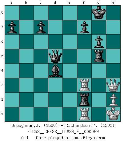 Last move : 0-1 2008 January 14 18:45:27 [Event "FICGS__CHESS__CLASS_E__000069"] [Site "FICGS"] [Date "2007.12.02"] [Round "1"] [White "Broughman,John"] [Black "Richardson,Patrick"] [Result "0-1"] [WhiteElo "1500"] [BlackElo "1203"] 1.d4 Nf6 2.Nf3 g6 3.Bg5 Bg7 4.e3 O-O 5.Bc4 d5 6.Bd3 Ne4 7.Nbd2 Nxg5 8.Nxg5 e5 9.Nh3 exd4 10.exd4 Re8+ 11.Be2 Bxh3 12.gxh3 Bxd4 13.O-O Bxb2 14.Rb1 Bg7 15.Rxb7 Nd7 16.Nf3 Nc5 17.Rb5 Na4 18.Rxd5 Qf6 19.Qd4 Rxe2 20.Qxa4 Qxf3 21.Rd3 Qf5 22.Qc6 Rc8 23.Rf3 Qxc2 24.Qd7 Rf8 25.h4 Be5 26.h5 Qe4 27.Qh3 Bd4 28.hxg6 hxg6 29.Qg2 Rxa2 30.Qh3 Re8 31.Qg3 Qd5 32.Kg2 Re5 33.Qh3 Rg5+ 34.Kh1 Rxf2 0-1 King's Indian : Torre attack Kingside Castling by player Black (move 4) Kingside Castling by player White (move 13) Player Black won this chess game. Follow this game move after move (download)The way he plays Chess demonstrates a man's whole nature. (Stanley Ellin) Wenn du gegen Bobby spielst, ist es keine Frage von gewinnen oder verlieren. Es ist eine Frage des Überlebens. (Boris Vassilievich Spassky) Yo adoro todas la posiciones. Denme una partida posicional difícil, y la jugaré. Pero posiciones totalmente ganadas, no las tolero. (Hein Donner) Vous savez, camarade Pachman, je n'éprouve pas de plaisir à être ministre, je jouerais plutôt aux échecs comme vous, ou alors ferais une révolution au Venezuela. (Che Guevara à Ludek Pachman, 'Checkmate in Prague', 1975) Art is the only way to run away without leaving home. (Twyla Tharp)