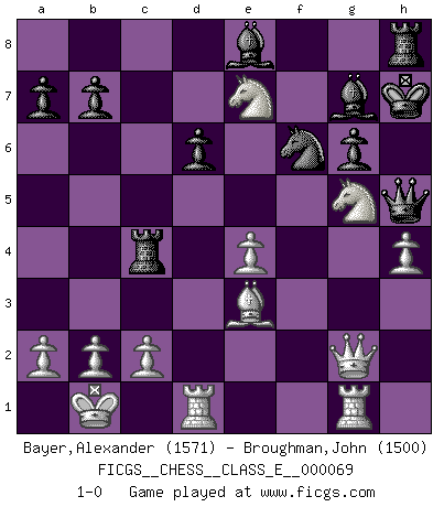 Last move : 1-0 2008 May 20 22:22:22 [Event "FICGS__CHESS__CLASS_E__000069"] [Site "FICGS"] [Date "2007.12.02"] [Round "1"] [White "Bayer,Alexander"] [Black "Broughman,John"] [Result "1-0"] [WhiteElo "1571"] [BlackElo "1500"] 1.e4 c5 2.Nf3 d6 3.d4 cxd4 4.Nxd4 Nf6 5.Nc3 g6 6.Be3 Bg7 7.f3 Nc6 8.Qd2 O-O 9.O-O-O Bd7 10.g4 Rc8 11.h4 h5 12.gxh5 Nxh5 13.Rg1 Kh7 14.Kb1 Ne5 15.f4 Nc4 16.Bxc4 Rxc4 17.f5 Qa5 18.fxg6+ fxg6 19.Qg2 Be8 20.Nd5 Nf6 21.Nxe7 Qh5 22.Ne6 Rh8 23.Ng5+ 1-0 Sicilian : Dragon, Yugoslav attack Kingside Castling by player Black (move 8) Queenside Castling by player White (move 9) Player White won this chess game. Follow this game move after move (download)Only sissies Castle. (Rob Sillars) Ich könnte leicht behaupten: Ja,ja, Leonid Breschnew wollte nicht, daß ich Weltmeister werde. In der Tat war die Sache komplizierter. (Viktor Kortschnoi) Debemos de asegurarnos de que el Ajedrez no se convierta en un lenguaje muerto, muy interesante, pero tan solo para un grupo muy pequeño. (Sytze Faber) Si le désir cupide (et stupide) de gagner est une inépuisable source de souffrance, une combinaison brillante sur l'échiquier est une découverte : le coquelicot qui s'épanouit lorsque apparaît la Voie Lactée. (Arrabal) Luck never gives; it only lends. (Swedish proverb)