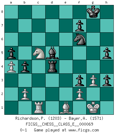 Last move : 0-1 2008 May 12 23:19:0 [Event "FICGS__CHESS__CLASS_E__000069"] [Site "FICGS"] [Date "2007.12.02"] [Round "1"] [White "Richardson,Patrick"] [Black "Bayer,Alexander"] [Result "0-1"] [WhiteElo "1203"] [BlackElo "1571"] 1.d4 Nf6 2.c4 e6 3.Nc3 Bb4 4.e3 O-O 5.Bd3 d5 6.Nf3 dxc4 7.Bxc4 c5 8.O-O cxd4 9.exd4 b6 10.Bg5 Bb7 11.Rc1 h6 12.Be3 Nc6 13.h3 Rc8 14.Qa4 a6 15.Bd3 Bd6 16.a3 b5 17.Qd1 Ne7 18.Ne5 Nf5 19.Bxf5 exf5 20.Qb3 Rc7 21.Rfe1 Re8 22.a4 b4 23.Ne2 Rce7 24.Nf4 g5 25.Nfd3 Bd5 26.Qc2 f4 27.Bd2 a5 28.Nc4 Re4 29.Nxd6 Qxd6 30.Rxe4 Rxe4 31.Qc5 Qxc5 32.Nxc5 Rxd4 33.Be1 f3 34.g3 h5 35.Kf1 g4 36.Kg1 gxh3 0-1 Nimzo-Indian : 4.e3 O-O, 5.Bd3 d5 Kingside Castling by player Black (move 4) Kingside Castling by player White (move 8) Player Black won this chess game. Follow this game move after move (download)Chess is a beautiful mistress. (Bent Larsen) Ich suche im Schach immer etwas Eigenes. Riskantes Spiel im Stile schachlicher Musketiere ist nicht meine Sache, auch wenn es vielen Freunden scharfer Wendungen gefällt. (Anatoly Karpov) ¿Que sería del Ajedrez sin errores graciosos?. (Kurt Richter) La victoire dans une partie d'Echecs appartient la plupart du temps à celui qui voit un peu plus loin que l'adversaire. (Lasker) The only thing that overcomes hard luck is hard work. (Harry Golden)