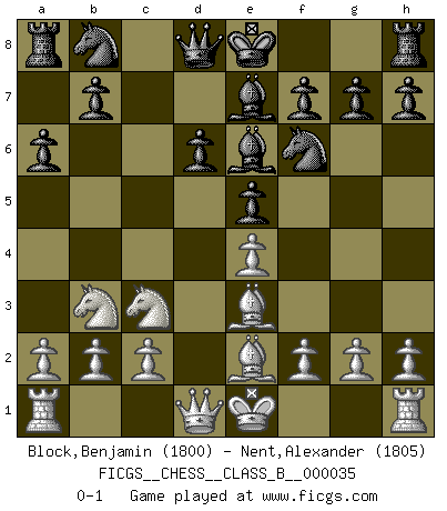 Last move : 0-1 2008 January 3 13:45:5 [Event "FICGS__CHESS__CLASS_B__000035"] [Site "FICGS"] [Date "2007.12.03"] [Round "1"] [White "Block,Benjamin"] [Black "Nent,Alexander"] [Result "0-1"] [WhiteElo "1800"] [BlackElo "1805"] 1.e4 c5 2.Nf3 d6 3.d4 cxd4 4.Nxd4 Nf6 5.Nc3 a6 6.Be3 e5 7.Nb3 Be6 8.Be2 Be7 0-1 Sicilian : Najdorf, Byrne (English) attack Player Black won this chess game. Follow this game move after move (download)All I want to do, ever, is just play Chess. (Bobby Fischer) Ohne ihre Erfolge schmälern zu wollen würde ich sagen Petrosian, Spassky und Karpov verdanken ihre Siege ihren Trainern - Boleslavsky, Bondarevsky und Furman. (Mikhail Moiseyevich Botvinik) Tu cuerpo tiene que estar en óptima condición. Tu Ajedrez se deteriora como lo hace tu cuerpo. No puedes separar la mente y el cuerpo. (Bobby Fischer) Aucun coup ne doit être joué sans but. (Pedro Damiano) Experience is the name we all give to our mistakes. (Oscar Wilde)