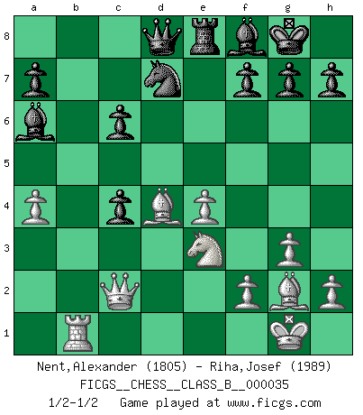 Last move : 1/2-1/2 2007 December 9 20:0:16 [Event "FICGS__CHESS__CLASS_B__000035"] [Site "FICGS"] [Date "2007.12.03"] [Round "1"] [White "Nent,Alexander"] [Black "Riha,Josef"] [Result "1/2-1/2"] [WhiteElo "1805"] [BlackElo "1989"] 1.d4 Nf6 2.c4 e6 3.Nf3 b6 4.g3 Ba6 5.b3 Bb4+ 6.Bd2 Be7 7.Bg2 c6 8.Bc3 d5 9.Ne5 Nfd7 10.Nxd7 Nxd7 11.Nd2 O-O 12.O-O Rc8 13.e4 dxc4 14.bxc4 b5 15.Re1 bxc4 16.Qa4 Bb5 17.Qc2 Re8 18.a4 Ba6 19.Rad1 Bf8 20.Nf1 Rb8 21.Rb1 e5 22.Ne3 exd4 23.Bxd4 Rxb1 24.Rxb1 1/2-1/2 Queen's Indian : Nimzovich variation (exaggerated Fianchetto) Kingside Castling by player Black (move 11) Kingside Castling by player White (move 12) This chess game ended in a draw. Follow this game move after move (download)Chess is a terrible game. If you have no center, your opponent has a freer position. If you do have a center, then you really have something to worry about ! (Siegbert Tarrasch) Die Idee von Capablanca, Schach als Fach in den Schulen zu lehren, ist großartig. (Fidel Castro) Haz el enroque temprano y seguido. (Rob Sillars) Le joueur d'Echecs qui veut atteindre le top est obligé de développer son propre credo créatif. Alexeï Stepanovicth Souétine. Il est facile d'écrire des livres ! Ce qui est difficile, c'est de jouer ! (Alexeï Stepanovicth Souétine) Plans are ideas that never come to fruition. (Daniel Parmet)