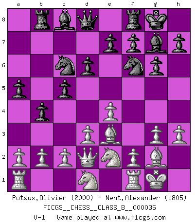Last move : 0-1 2008 February 17 1:35:42 [Event "FICGS__CHESS__CLASS_B__000035"] [Site "FICGS"] [Date "2007.12.03"] [Round "1"] [White "Potaux,Olivier"] [Black "Nent,Alexander"] [Result "0-1"] [WhiteElo "2000"] [BlackElo "1805"] 1.e4 c5 2.Nc3 Nc6 3.g3 g6 4.Bg2 Bg7 5.Nge2 d6 6.d3 Nf6 7.h3 O-O 8.Be3 Rb8 9.O-O b5 10.Qd2 b4 11.Nd1 a5 0-1 Sicilian : Closed Kingside Castling by player Black (move 7) Kingside Castling by player White (move 9) Player Black won this chess game. Follow this game move after move (download)A strong memory, concentration, imagination, and a strong will is required to become a great Chess player. (Bobby Fischer) Frage: Was machen Sie mit den Preisen? Anwort: Ich habe Angst, dass meine Freundin davon neue Kleider kauft. (Loek van Wely) Uno por uno, yo los acribillé, mi superioridad muy pronto se volvio aparente. (Jose Capablanca) Les erreurs sont comme les malheurs, elles n'arrivent jamais seules. (Siegbert Tarrasch) Hello Thibault, if I have had a plan (and I had one, I hope), I have forgotten it during the last week... - Hello Heinz-Georg. What do you mean a plan ? (Anonymous players, during a Big Chess game)
