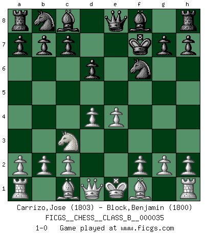 Last move : 1-0 2008 January 2 18:20:27 [Event "FICGS__CHESS__CLASS_B__000035"] [Site "FICGS"] [Date "2007.12.03"] [Round "1"] [White "Carrizo,Jose"] [Black "Block,Benjamin"] [Result "1-0"] [WhiteElo "1803"] [BlackElo "1800"] 1.e4 e5 2.Nf3 Nf6 3.Nxe5 d6 4.Nxf7 Kxf7 5.d4 Qe8 6.Nc3 1-0 Petrov : Cochrane gambit Player White won this chess game. Follow this game move after move (download)Some sacrifices are sound; the rest are mine. (Mikhail Tal) Strategie ist, wie man ein Mädchen auf den Rücksitz bekommt. Taktik ist, was man tut, wenn man dann dort ist. (Anonymous) Una buena memoria, concentración, imaginación y una fuerte voluntad, se requiere para llegar a ser un buen jugador. (Bobby Fischer) RxDa4 pat (...) The problem with manipulation is that people can turn on you. (Horatio Caine, C.S.I. Miami)