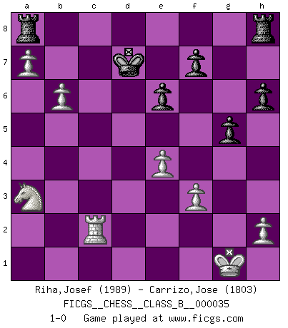 Last move : 1-0 2008 February 23 1:20:17 [Event "FICGS__CHESS__CLASS_B__000035"] [Site "FICGS"] [Date "2007.12.03"] [Round "1"] [White "Riha,Josef"] [Black "Carrizo,Jose"] [Result "1-0"] [WhiteElo "1989"] [BlackElo "1803"] 1.d4 d5 2.c4 e6 3.Nf3 c6 4.Qc2 Nf6 5.Bg5 h6 6.Bh4 dxc4 7.Qxc4 b5 8.Qc2 Bb7 9.e3 Nbd7 10.Bd3 Rc8 11.O-O a6 12.a4 c5 13.axb5 Bxf3 14.gxf3 cxd4 15.Qe2 Nc5 16.bxa6 Nxd3 17.Qxd3 g5 18.Bg3 dxe3 19.Qxd8+ Rxd8 20.fxe3 Nd5 21.e4 Bc5+ 22.Bf2 Bxf2+ 23.Rxf2 Nc7 24.b4 Ra8 25.a7 Nb5 26.Ra5 Nd4 27.b5 Kd7 28.Na3 Nb3 29.Ra4 Nc5 30.Rd4+ Ke7 31.b6 Nd7 32.Rxd7+ Kxd7 33.Rc2 1-0 Queen's gambit declined Kingside Castling by player White (move 11) Player White won this chess game. Follow this game move after move (download)Chess is the art of analysis. (Mikhail Botvinnik) Ein Buch ist ein Spiegel; wenn ein Affe hineinsieht, so kann kein Apostel heraus gucken. (Georg Christoph Lichtenberg) Prefiero perder una partida realmente buena, que ganar una mala. (David Levy) Pour se monter efficace, un Cavalier a besoin d'avant-postes ! Les Cavaliers font les meilleurs bloqueurs de pions passés. The next best thing to gambling and winning is gambling and loosing. (Nick Dandalos)
