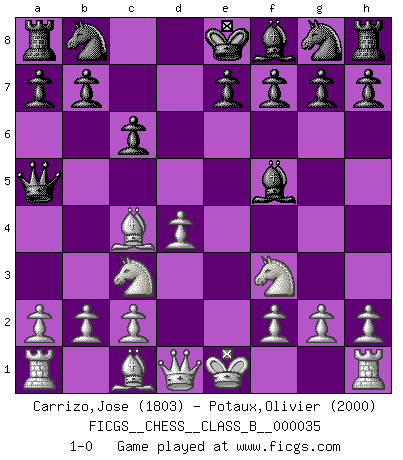 Last move : 1-0 2008 February 6 0:44:6 [Event "FICGS__CHESS__CLASS_B__000035"] [Site "FICGS"] [Date "2007.12.03"] [Round "1"] [White "Carrizo,Jose"] [Black "Potaux,Olivier"] [Result "1-0"] [WhiteElo "1803"] [BlackElo "2000"] 1.e4 d5 2.exd5 Qxd5 3.Nc3 Qa5 4.d4 c6 5.Bc4 Bf5 6.Nf3 1-0 This chess game has been lost on time (started : 2007.12.03 0:17:22) Scandinavian (centre counter) defense Player White won this chess game. Follow this game move after move (download)The Pin is mightier than the sword. (Fred Reinfeld) Du musst Deinen Gegner in einen tiefen dunklen Wald führen wo 2+2=5 ist und wo der Weg, der wieder hinausführt, nur breit genug für einen ist. (Mikhail Nekhemyevich Tal) El Ajedrez es como la guerra en un tablero. (Bobby Fischer) Assurément je connaissais par expérience le mystérieux attrait de ce jeu royal, le seul entre tous les jeux inventés par les hommes qui échappe souverainement à la tyrannie du hasard, le seul où l'on ne doive sa victoire qu'à son intelligence ou plutôt à une certaine forme d'intelligence. Mais n'est-ce pas déjà le limiter injurieusement que d'appeler les échecs un jeu ? N'est-ce pas une science, un art ou quelque chose qui, comme le cercueil de Mahomet entre ciel et terre, est suspendu entre l'un et l'autre, et qui réunit un nombre incroyable de contraires ? [...] C'est une pensée qui ne mène à rien, une mathématique qui n'établit rien, un art qui ne laisse pas d'uvre, une architecture sans matière; et il l'a prouvé néanmoins qu'il était plus durable, à sa manière, que les livres ou que tout autre monument, ce jeu unique qui appartient à tous les peuples et à tous les temps, et dont personne ne sait quel dieu en fit don à la terre pour tuer l'ennui, pour aiguiser l'esprit et stimuler l'âme. Où commence-t-il, où finit-il ? (Stefan Zweig) May the force be with you. (Han Solo in Star Wars ep.4)