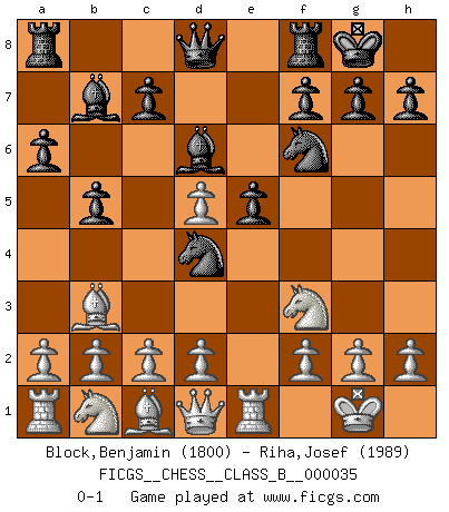 Last move : 0-1 2008 January 2 18:23:0 [Event "FICGS__CHESS__CLASS_B__000035"] [Site "FICGS"] [Date "2007.12.03"] [Round "1"] [White "Block,Benjamin"] [Black "Riha,Josef"] [Result "0-1"] [WhiteElo "1800"] [BlackElo "1989"] 1.e4 e5 2.Nf3 Nc6 3.Bb5 a6 4.Ba4 Nf6 5.O-O b5 6.Bb3 Bb7 7.Ng5 d5 8.exd5 Nd4 9.Re1 Bd6 10.Nf3 O-O 0-1 Ruy Lopez : Archangelsk (counterthrust) variation Kingside Castling by player White (move 5) Kingside Castling by player Black (move 10) Player Black won this chess game. Follow this game move after move (download)Chess is a fighting game which is purely intellectual and includes chance. (Richard Reti) Ich rechne überhaupt nicht voraus. Ich gewinne auch so. (Robert James Fischer) Te sientas frente a un tablero y repentinamente tu corazón brinca. Tu mano tiembla al tomar una pieza y moverla. Pero lo que el Ajedrez te enseña es que tu debes permanecer ahí con calma y pensar de que si realmente es una buena idea o de que si hay otras ideas mejores. (Stanley Kubrick) Le système Elo représente seulement une moyenne. Il est simplement un indicateur de votre stabilité. (Anatoli Karpov) The good fighters of old first put themselves beyond the possibility of defeat, and then waited for an opportunity of defeating the enemy. (Sun Tzu)