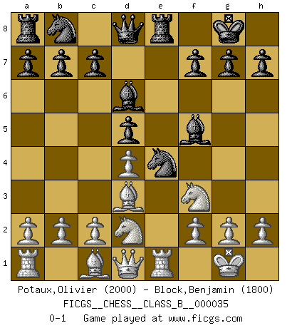 Last move : 0-1 2008 January 27 0:3:57 [Event "FICGS__CHESS__CLASS_B__000035"] [Site "FICGS"] [Date "2007.12.03"] [Round "1"] [White "Potaux,Olivier"] [Black "Block,Benjamin"] [Result "0-1"] [WhiteElo "2000"] [BlackElo "1800"] 1.e4 e5 2.Nf3 Nf6 3.Nxe5 d6 4.Nf3 Nxe4 5.d4 d5 6.Bd3 Bd6 7.O-O O-O 8.Nbd2 Re8 9.Re1 Bf5 0-1 This chess game has been lost on time (started : 2007.12.03 0:17:22) Petrov : Classical attack, Marshall variation Kingside Castling by player White (move 7) Kingside Castling by player Black (move 7) Player Black won this chess game. Follow this game move after move (download)The older I grow, the more I value pawns. (Paul Keres) Ich brauche nur einen Blick auf das Schachbrett zu werfen, und weiß schon, was in der Stellung steckt, was geschehen kann und was geschehen wird. Alle übrigen suchen und prüfen, ich aber weiß es! (José Raúl Capablanca) Morphy probablemente fue el genio más grande de todos. (Bobby Fischer) Dans le domaine de la peinture, de la gravure et de la sculpture, dès la première décennie de notre siècle, les artistes abandonnent la représentation de la partie d'échecs pour se concentrer sur les pièces, sur les échiquiers et sur toutes les variations auxquelles les unes et les autres peuvent donner lieu. On passe en quelque sorte d'un thème social à un thème musical (au sens de la musica médiévale, c'est-à-dire d'une notion qui inclue le rythme, l'harmonie, la construction et la déconstruction, etc.). Graphiquement et picturalement, l'échiquier apparaît comme une structure ouverte, dynamique, d'une richesse infinie, autorisant toutes les combinatoires et débouchant sur des mouvements et des rythmes de nature exponentielle. (Michel Pastoureau) Those parts of the system that you can hit with a hammer (not advised) are called hardware; those program instructions that you can only curse at are called software. (Anonymous)