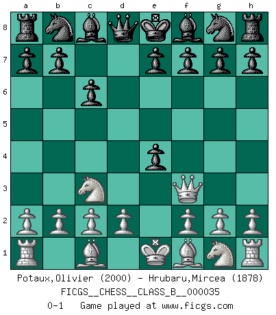 Last move : 0-1 2008 February 9 0:53:3 [Event "FICGS__CHESS__CLASS_B__000035"] [Site "FICGS"] [Date "2007.12.03"] [Round "1"] [White "Potaux,Olivier"] [Black "Hrubaru,Mircea"] [Result "0-1"] [WhiteElo "2000"] [BlackElo "1878"] 1.e4 c6 2.Nc3 d5 3.Qf3 dxe4 0-1 This chess game has been lost on time (started : 2007.12.03 0:17:22) Caro-Kann : GOldman (Spielmann) variation Player Black won this chess game. Follow this game move after move (download)In order to improve your game, you must study the endgame before everything else, for whereas the endings can be studied and mastered by themselves, the middle game and the opening must be studied in relation to the endgame. (Jose Raul Capablanca) Fischer: 'Remis!?' Uhlmann: 'Aber es muss doch dreimal Zugwiederholung sein!' Fischer: 'Sie nehmen das Remis an, wie ich es sage, sonst spiele ich weiter und werde Sie dann schlagen!' (Robert James Fischer) El Ajedrez es despiadado: debes de estar preparado para matar gente. (Nigel Short) Mais l'homme est une créature légère et illogique : semblable au joueur d'échecs, il n'aime que le processus du but à atteindre, non le but lui-même. (Dostoïevsky) Gambling is the son of avarice and the father of despair. (French proverb)