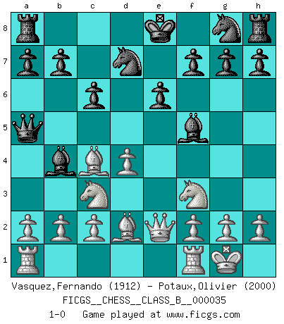 Last move : 1-0 2008 January 15 11:14:12 [Event "FICGS__CHESS__CLASS_B__000035"] [Site "FICGS"] [Date "2007.12.03"] [Round "1"] [White "Vasquez,Fernando"] [Black "Potaux,Olivier"] [Result "1-0"] [WhiteElo "1912"] [BlackElo "2000"] 1.e4 d5 2.exd5 Qxd5 3.Nc3 Qa5 4.d4 c6 5.Nf3 Bf5 6.Bc4 e6 7.Bd2 Nd7 8.Qe2 Bb4 9.O-O 1-0 This chess game has been lost on time (started : 2007.12.03 0:17:22) Scandinavian (centre counter) defense Kingside Castling by player White (move 9) Player White won this chess game. Follow this game move after move (download)The battle for the ultimate truth will never be won. And that's why Chess is so fascinating. (Hans Kmoch) Auf jeden Fall musst du zuerst Rechtsanwalt werden, damit du deine eigenen Interessen und die deiner Familie vertreten kannst. [Brief an seinen Sohn] (José Raúl Capablanca) Si el ingenio solamente fuese necesario para lucirse, las mujeres serían las mejores jugadoras de Ajedrez del mundo. (Albin) Fischer est le meilleur joueur du monde et Karpov n'est qu'un joueur de bistrot. (Garry Kasparov, agé de 16 ans) I feel so... helpless. (C-3PO in Star Wars ep.3)