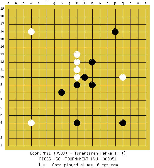 Last move : 1-0 2008 January 14 23:13:59 [Event "FICGS__GO__TOURNAMENT_KYU__000051"] [Site "FICGS"] [Date "2007.12.03"] [Round "1"] [Black "Cook,Phil"] [White "Turakainen,Pekka I."] [Result "1-0"] [Rating 1 "0599"] 1.q4 d4 2.k4 k10 3.m9 d16 4.p16 q10 5.l10 k11 6.k9 k12 7.m12 k13 8.h8 1-0 This go game has been lost on time (started : 2007.12.03 18:58:45) Here are the names of the openings (joseki) played in the four corners : Corner d4 : d4 h8 Hoshi (Hwajeom, Seongjeom, Xingwei`) 4-4 Point. The star or hoshi (4-4) point, emphasizing influence at the potential expense of territory. Player Black won this Go (weiqi, baduk) game. Follow this game move after move (download)Proverbs do not apply to White. (Tero Sand) Depression is just anger without enthusiasm. (Unknown)