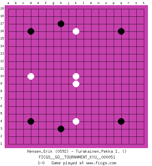 Last move : 1-0 2008 January 17 11:24:23 [Event "FICGS__GO__TOURNAMENT_KYU__000051"] [Site "FICGS"] [Date "2007.12.03"] [Round "1"] [Black "Hensen,Erik"] [White "Turakainen,Pekka I."] [Result "1-0"] [Rating 1 "0592"] 1.q16 k10 2.q4 k4 3.d4 d10 4.d16 k16 5.h17 k9 6.h3 1-0 This go game has been lost on time (started : 2007.12.03 18:58:45) Here are the names of the openings (joseki) played in the four corners : Player Black won this Go (weiqi, baduk) game. Follow this game move after move (download)While the Baroque rules of chess could only have been created by humans, the rules of go are so elegant, organic, and rigorously logical that if intelligent life forms exist elsewhere in the universe, they almost certainly play go. (Edward Lasker, international chess master) Wikichess, chess moves explained by 'experimented' players. (Thibault de Vassal)