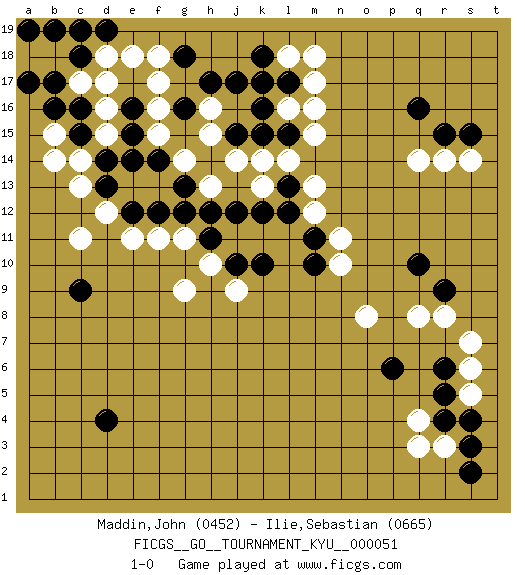 Last move : 1-0 2008 May 12 9:41:1 [Event "FICGS__GO__TOURNAMENT_KYU__000051"] [Site "FICGS"] [Date "2007.12.03"] [Round "1"] [Black "Maddin,John"] [White "Ilie,Sebastian"] [Result "1-0"] [Rating 1 "0452"] [Rating 2 "0665"] 1.d4 q3 2.q16 d17 3.c16 c14 4.c18 c17 5.b17 d18 6.c19 b15 7.b16 a18 8.a17 b18 9.b19 d16 10.c15 d15 11.a19 b14 12.d19 e18 13.d14 c11 14.c9 e11 15.e14 f15 16.e15 f16 17.e16 f17 18.f14 g14 19.e12 d12 20.d13 c13 21.f12 f11 22.g12 h10 23.j12 j14 24.l13 h13 25.h12 k13 26.k12 l14 27.k15 k14 28.l15 m13 29.l12 m15 30.j17 m17 31.l17 l18 32.k18 l16 33.k16 k17 34.j15 h15 35.l17 m16 36.k17 m18 37.g18 f18 38.g16 h16 39.h17 m12 40.m11 n11 41.m10 n10 42.j10 j9 43.k10 g9 44.h11 g11 45.g13 r14 46.s15 s14 47.r15 q14 48.q10 q8 49.r9 r8 50.r4 r3 51.s3 s5 52.s4 q4 53.r5 s6 54.r6 s7 55.p6 o8 56.s2 1-0 This go game has been lost on time (started : 2007.12.03 18:58:45) Here are the names of the openings (joseki) played in the four corners : Corner d16 : d17 c16 Komoku (Somok, Xiao~mu`) 3-4 Point. The komoku (3-4) point is the traditional corner enclosure move.. Player Black won this Go (weiqi, baduk) game. Follow this game move after move (download)If you lose by one point, take a rest. (Anonymous) Perseverance does not equal worthiness. Next time you want to get my attention, wear something fun. Low-riding jeans are hot. (Gregory House, House M.D.)