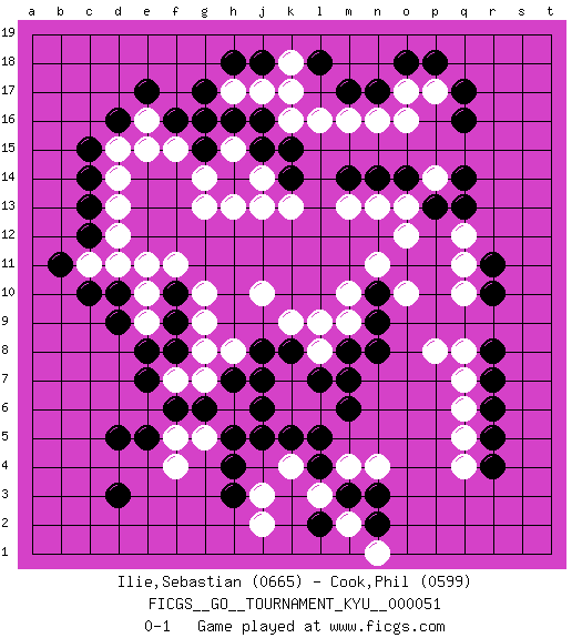Last move : 0-1 2008 May 26 22:48:0 [Event "FICGS__GO__TOURNAMENT_KYU__000051"] [Site "FICGS"] [Date "2007.12.03"] [Round "1"] [Black "Ilie,Sebastian"] [White "Cook,Phil"] [Result "0-1"] [Rating 1 "0665"] [Rating 2 "0599"] 1.q16 q4 2.d3 f4 3.h4 g5 4.d5 q11 5.d16 k4 6.j5 k6 7.j6 k7 8.j7 k9 9.j8 j10 10.k8 k16 11.k5 d12 12.d10 f11 13.f9 g10 14.l4 m9 15.m8 l8 16.l7 l9 17.n8 l6 18.m7 m4 19.m6 o10 20.r6 q6 21.r5 q5 22.r4 h8 23.g6 h6 24.h7 g7 25.f6 g9 26.f8 g8 27.h5 f7 28.e7 l3 29.l5 p8 30.r7 q7 31.r8 q8 32.q13 o13 33.g16 h15 34.g15 g13 35.h14 j14 36.j15 f5 37.e5 j3 38.h3 j2 39.m3 m2 40.n3 n4 41.n2 n1 42.l2 e10 43.d9 e9 44.e8 c11 45.c10 p17 46.q17 h13 47.h16 g14 48.k14 h15 49.k15 l16 50.h14 j13 51.n17 o16 52.p18 n16 53.m17 m16 54.c14 d14 55.c13 d13 56.b11 d15 57.c15 k13 58.m14 m13 59.n14 n13 60.o14 p14 61.p13 o12 62.q14 h15 63.j16 k17 64.j18 j17 65.h18 f15 66.f16 h17 67.g17 k18 68.o18 o17 69.l18 e16 70.e17 e15 71.n9 m10 72.n10 n11 73.c12 d11 74.f10 e11 75.r10 q10 76.r11 q12 0-1 This go game has been lost on time (started : 2007.12.03 18:58:45) Here are the names of the openings (joseki) played in the four corners : Corner d4 : d3 f4 Komoku (Somok, Xiao~mu`) 3-4 Point. The komoku (3-4) point is the traditional corner enclosure move.. Corner q16 : q16 q11 Hoshi (Hwajeom, Seongjeom, Xingwei`) 4-4 Point. The star or hoshi (4-4) point, emphasizing influence at the potential expense of territory. Corner d16 : d16 d12 Hoshi (Hwajeom, Seongjeom, Xingwei`) 4-4 Point. The star or hoshi (4-4) point, emphasizing influence at the potential expense of territory. Corner q4 : q4 l4 Hoshi (Hwajeom, Seongjeom, Xingwei`) 4-4 Point. The star or hoshi (4-4) point, emphasizing influence at the potential expense of territory. Player White won this Go (weiqi, baduk) game. Follow this game move after move (download)Go is essentially a form of harmony. Go in the 21st century will have to be go of the 'harmony of the six points - the four quarters, the above and the below.' As in life we will need to view the whole rather than the part. Japanese go has focused too heavily on the local (joseki) rather than the whole for 300 years. The reason the Chinese and Koreans are overtaking the Japanese is that they are closer to achieve this whole-board view. (Go Seigen, 9p, 1994) No man has ever achieved immortality in his own life time. (Unknown)