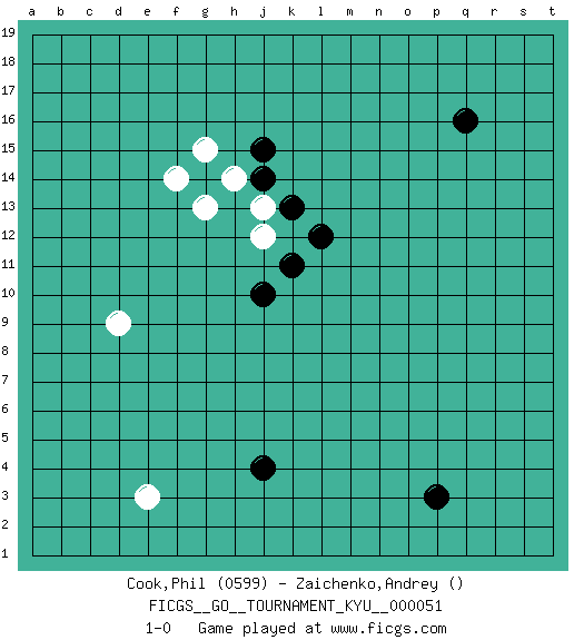 Last move : 1-0 2007 December 12 7:4:27 [Event "FICGS__GO__TOURNAMENT_KYU__000051"] [Site "FICGS"] [Date "2007.12.03"] [Round "1"] [Black "Cook,Phil"] [White "Zaichenko,Andrey"] [Result "1-0"] [Rating 1 "0599"] 1.q16 e3 2.p3 d9 3.j4 f14 4.j14 j13 5.k13 j12 6.l12 h14 7.j15 g15 8.k11 g13 9.j10 1-0 Here are the names of the openings (joseki) played in the four corners : Corner d16 : f14 j14 This joseki is unknown. A weak or weird move has probably been played in this corner. Player Black won this Go (weiqi, baduk) game. Follow this game move after move (download)The carpenter's square becomes ko. (Anonymous) I live to kill Traxler counterattack. (Ilmars Cirulis)