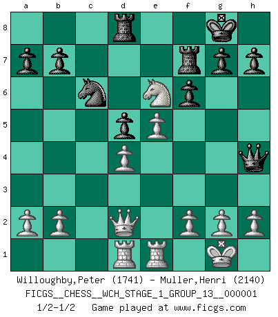 Last move : 1/2-1/2 2006 July 11 18:12:55 [Event "FICGS__CHESS__WCH_STAGE_1_GROUP_13__000001"] [Site "FICGS"] [Date "2006.07.01"] [Round "1"] [White "Willoughby,Peter"] [Black "Muller,Henri"] [Result "1/2-1/2"] [WhiteElo "1741"] [BlackElo "2140"] 1.e4 c5 2.Nf3 d6 3.Bb5+ Bd7 4.Bxd7+ Qxd7 5.O-O Nc6 6.c3 Nf6 7.Re1 e6 8.d4 cxd4 9.cxd4 d5 10.e5 Ne4 11.Ng5 Nxg5 12.Bxg5 Be7 13.Bxe7 Qxe7 14.Nc3 O-O 15.Qd2 Qh4 16.Rad1 f6 17.Nb5 Rad8 18.Nc7 Rf7 19.Nxe6 1/2-1/2 Sicilian : Canal-Sokolsky attack, 3...Bd7 Kingside Castling by player White (move 5) Kingside Castling by player Black (move 14) This chess game ended in a draw. Follow this game move after move (download)Pawns are born free, yet they are everywhere in chains. (Rick Kennedy) Kasparov ist eine Art Monster mit hundert Augen, denen auch nicht das Geringste entgeht. (Tony Miles) Una buena ofensiva y una buena defensa, comienzan ambas con un buen desarrollo. (Bruce A. Moon) Nous sommes les pions de la mystérieuse partie d'Echecs jouée par Dieu. Il nous déplace, nous arrête, nous pousse encore, puis nous lance un à un dans la boîte du Néant. Epitaphe sur la tombe de David Janowsky (1868-1927). Without deviation from the norm, progress is not possible. (Frank Zappa)