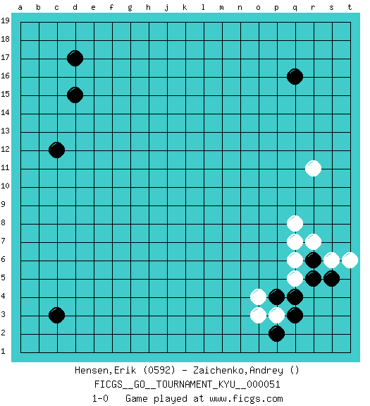 Last move : 1-0 2007 December 15 10:10:19 [Event "FICGS__GO__TOURNAMENT_KYU__000051"] [Site "FICGS"] [Date "2007.12.03"] [Round "1"] [Black "Hensen,Erik"] [White "Zaichenko,Andrey"] [Result "1-0"] [Rating 1 "0592"] 1.q16 r11 2.c3 o3 3.d15 q8 4.r6 r7 5.q3 q6 6.r5 q5 7.q4 s6 8.s5 q7 9.c12 t6 10.p4 p3 11.d17 o4 12.p2 1-0 Here are the names of the openings (joseki) played in the four corners : Corner q16 : q16 r11 Hoshi (Hwajeom, Seongjeom, Xingwei`) 4-4 Point. The star or hoshi (4-4) point, emphasizing influence at the potential expense of territory. Player Black won this Go (weiqi, baduk) game. Follow this game move after move (download)Go is not a blocking game, it's a game of action. (Pierre Audouard) All the biggest technological inventions created by man - the airplane, the automobile, the computer - says little about his intelligence, but speaks volumes about his laziness. (Mark Kennedy)