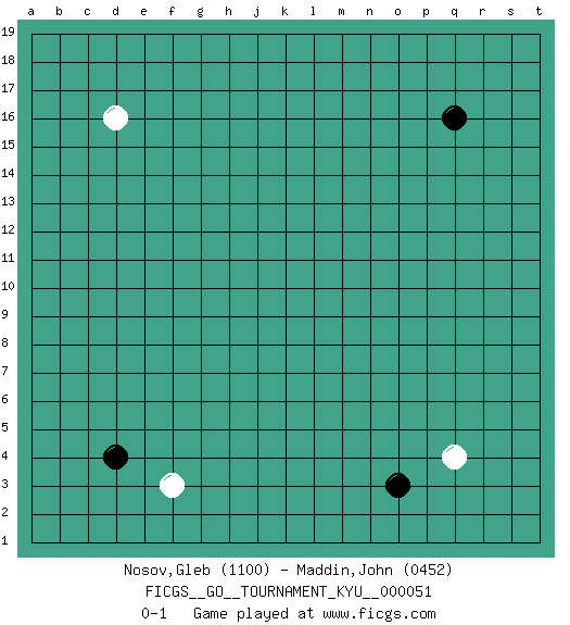 Last move : 0-1 2008 January 7 10:50:45 [Event "FICGS__GO__TOURNAMENT_KYU__000051"] [Site "FICGS"] [Date "2007.12.03"] [Round "1"] [Black "Nosov,Gleb"] [White "Maddin,John"] [Result "0-1"] [Rating 1 "1100"] [Rating 2 "0452"] 1.q16 d16 2.d4 q4 3.o3 f3 0-1 This go game has been lost on time (started : 2007.12.03 18:58:45) Here are the names of the openings (joseki) played in the four corners : Corner q4 : q4 o3 Hoshi (Hwajeom, Seongjeom, Xingwei`) 4-4 Point. The star or hoshi (4-4) point, emphasizing influence at the potential expense of territory. Ikken Kakari (Hankan Keolch'im, Yi Gua`jiao~, 1-Space Low Approach). Black 2 is the standard approach move to the 4-4. Corner d4 : d4 f3 Hoshi (Hwajeom, Seongjeom, Xingwei`) 4-4 Point. The star or hoshi (4-4) point, emphasizing influence at the potential expense of territory. Ikken Kakari (Hankan Keolch'im, Yi Gua`jiao~, 1-Space Low Approach). White 2 is the standard approach move to the 4-4. Player White won this Go (weiqi, baduk) game. Follow this game move after move (download)With only one group, you will win. (Anonymous) You know what they say : You lie down with the Devil, you wake up in Hell. (Horatio Caine, C.S.I. Miami)